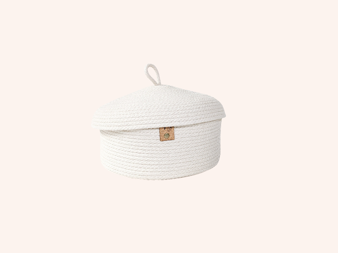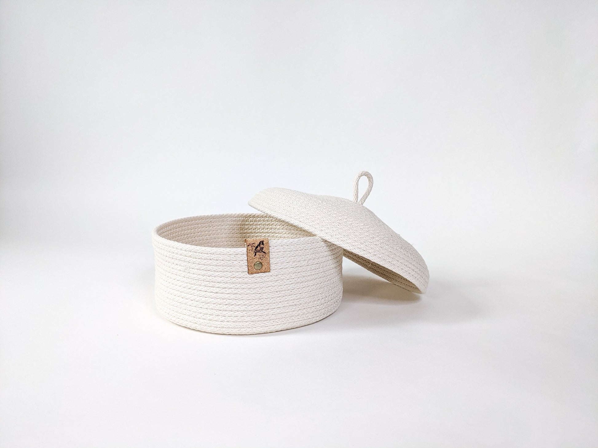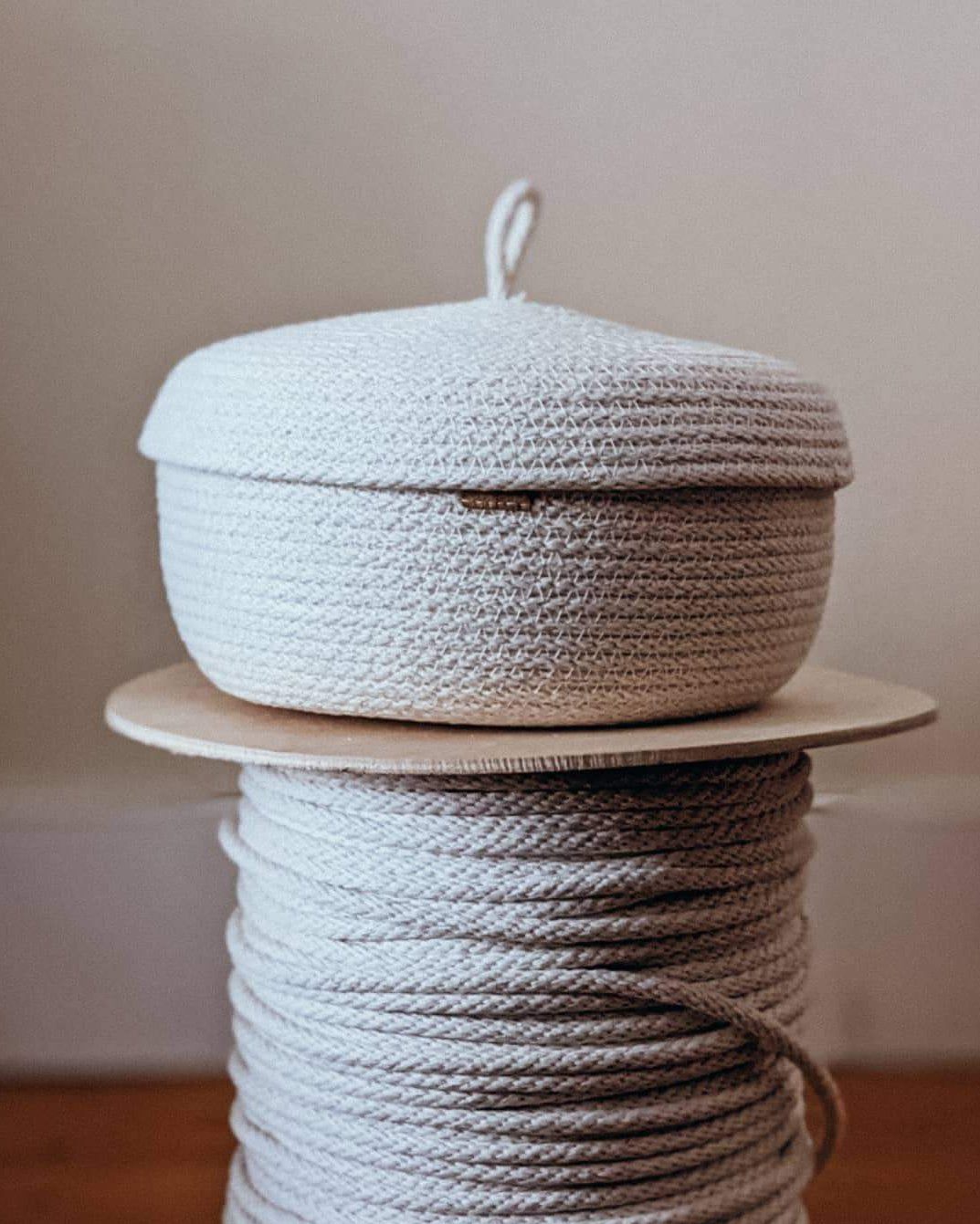 This unique basket was constructed on a sewing machine, coiled by hand, using 100% cotton rope and thread.