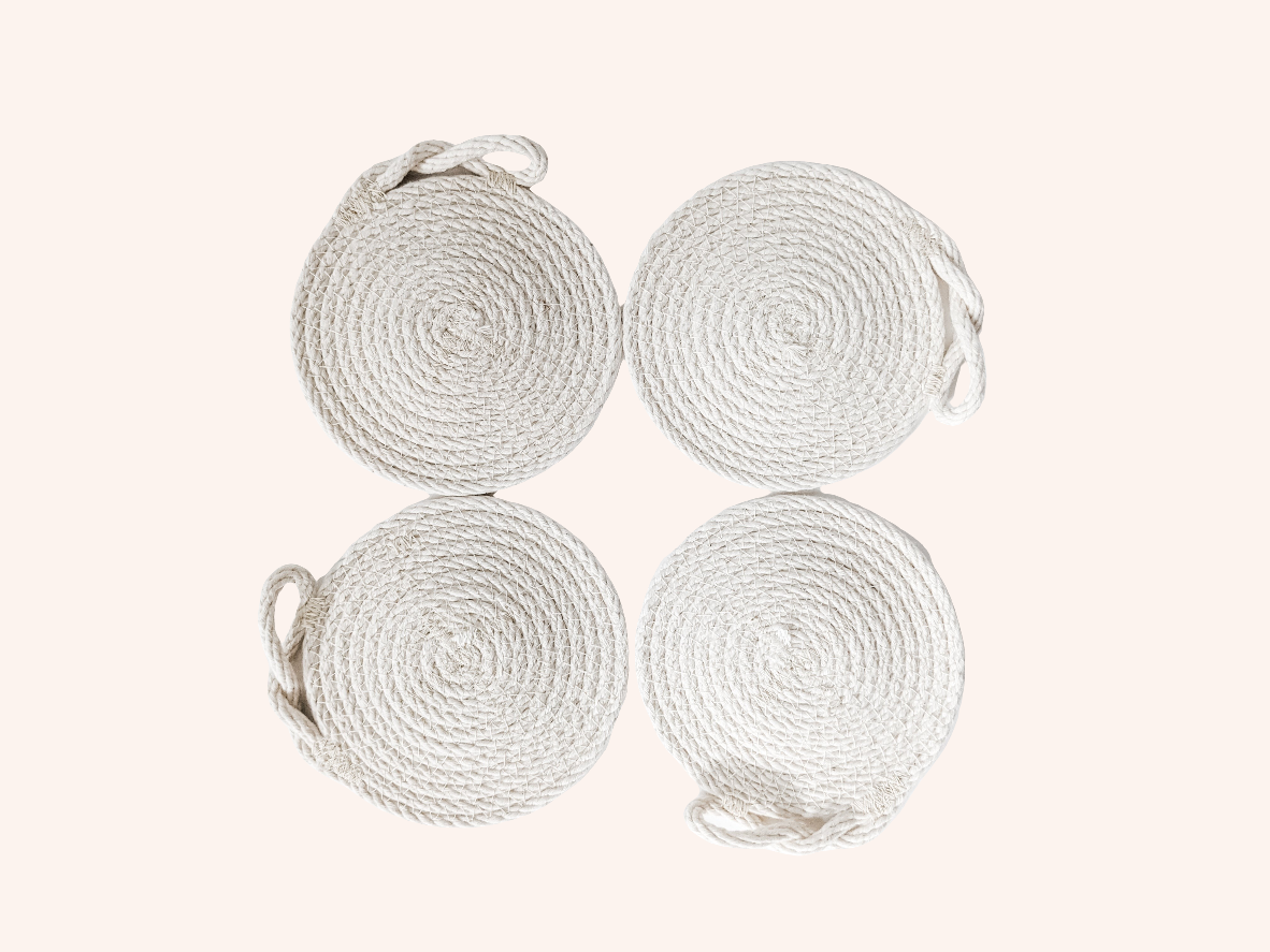 These coasters were constructed on a sewing machine, coiled by hand, using 100% cotton rope and thread.
