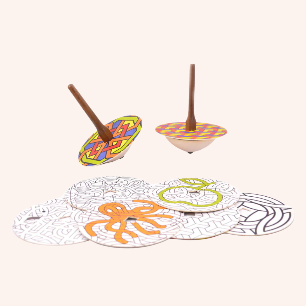 A robust two-handed spinning top that comes with four printed cardboard disks that are customizable. Comes with instructions.