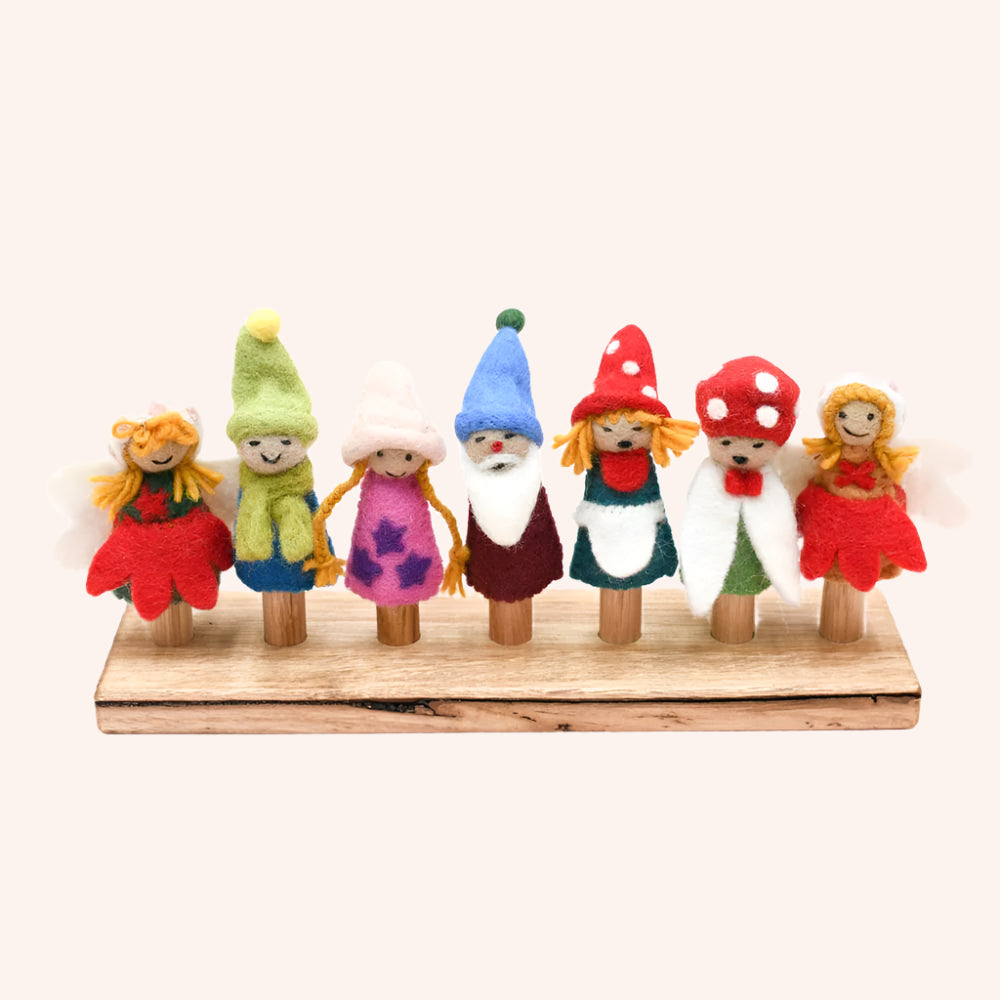 Create an enchanting storytelling session or a magical playtime with our meticulously handfelted fairies and gnomes finger puppet set. These exquisite finger puppets will ignite the imagination of children and bring them to a far far away place.