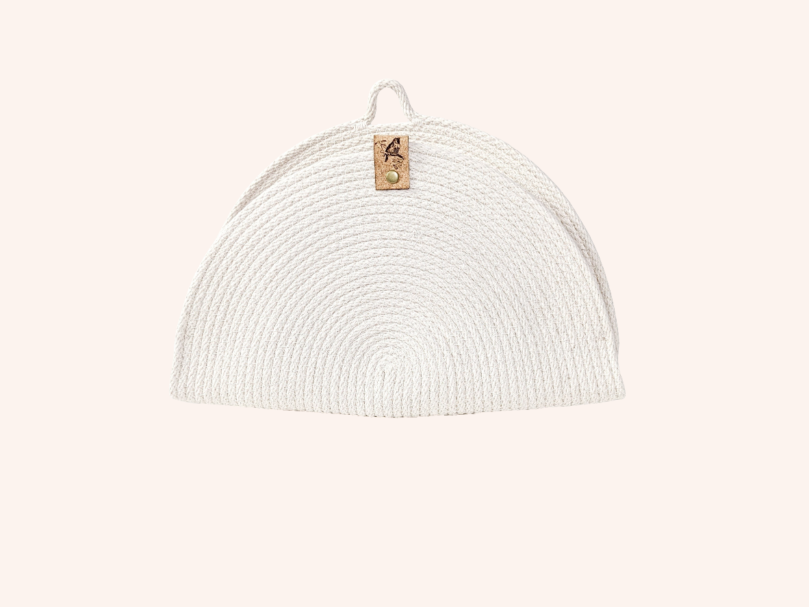This unique letter holder was constructed on a sewing machine, coiled by hand, using 100% cotton rope and thread. It is finished off with a cork tag.