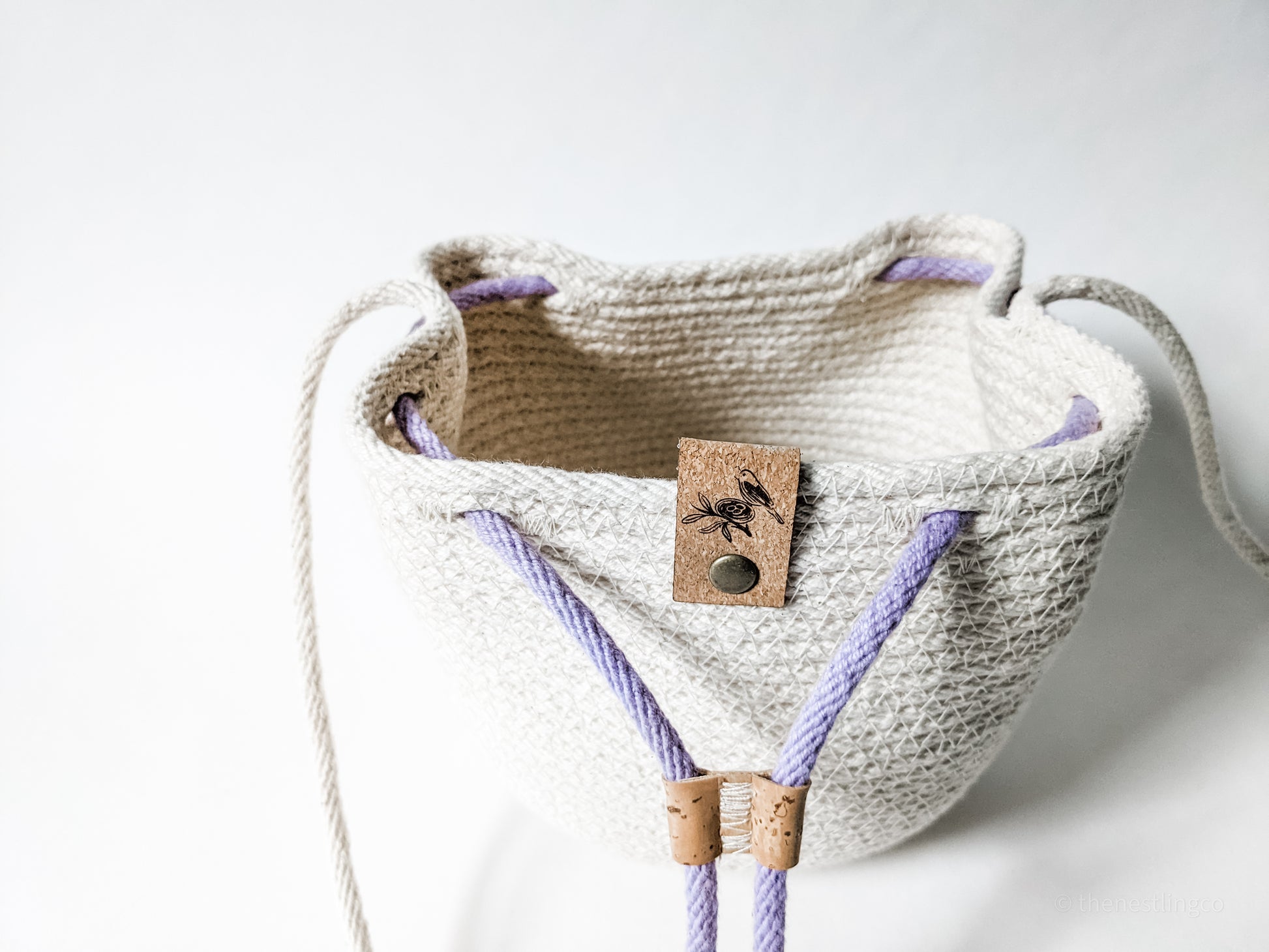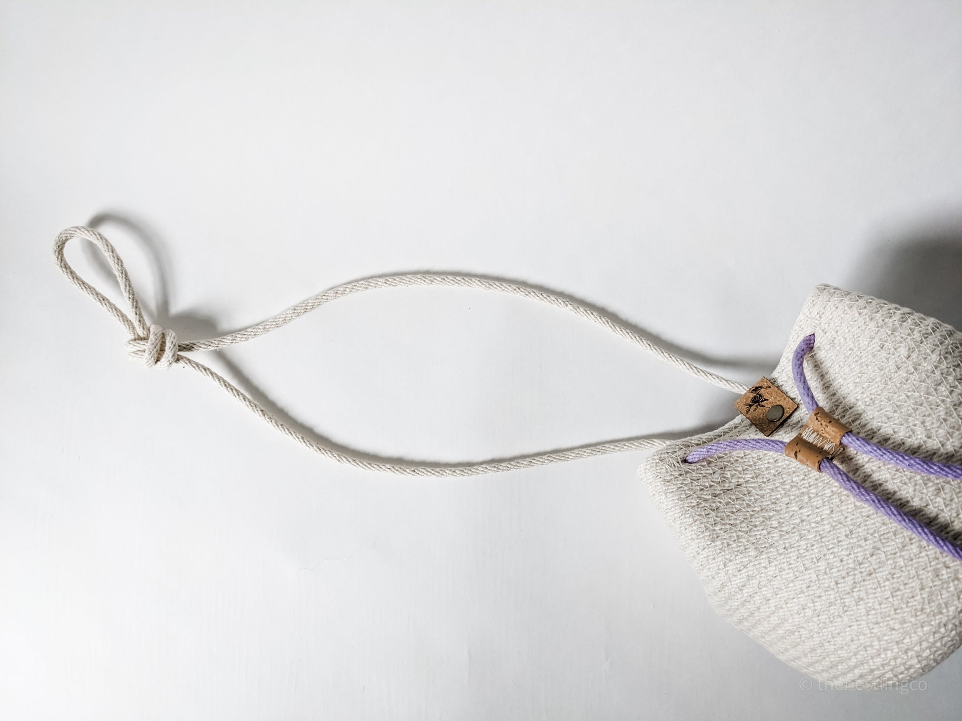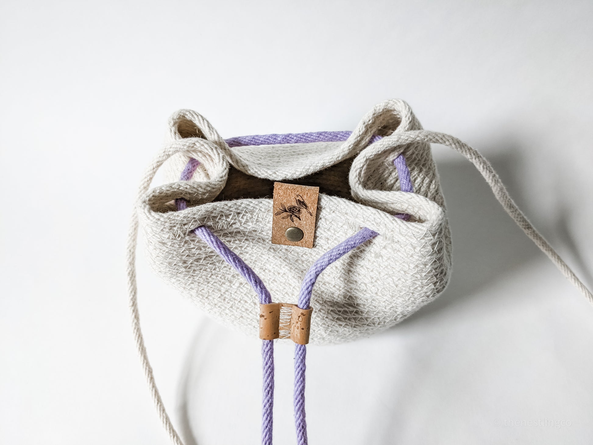 Made with 100% cotton rope with polyester thread. Hand dyed cording for the drawstring, and finished off with a cork tag.