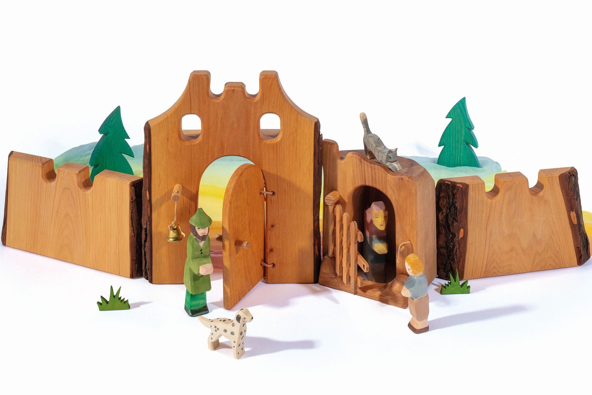 This charming Gate with Door adds an inviting entrance to castles, villages, or garden scenes. Hand-carved from solid wood, it features a functional door and bell, encouraging imaginative play and storytelling. Perfect for small-world adventures, castle settings, or woodland villages, it helps create a sense of place and exploration.