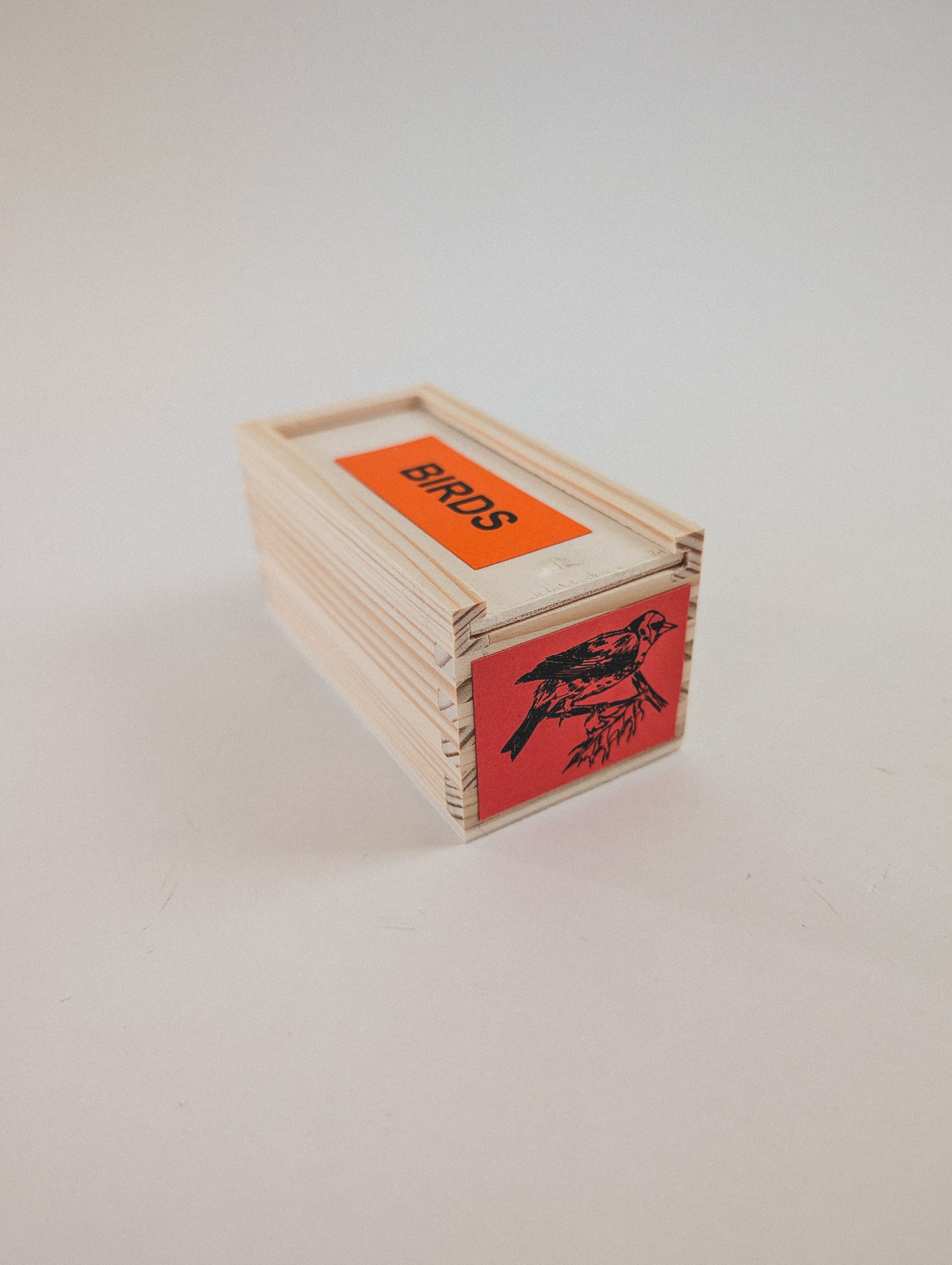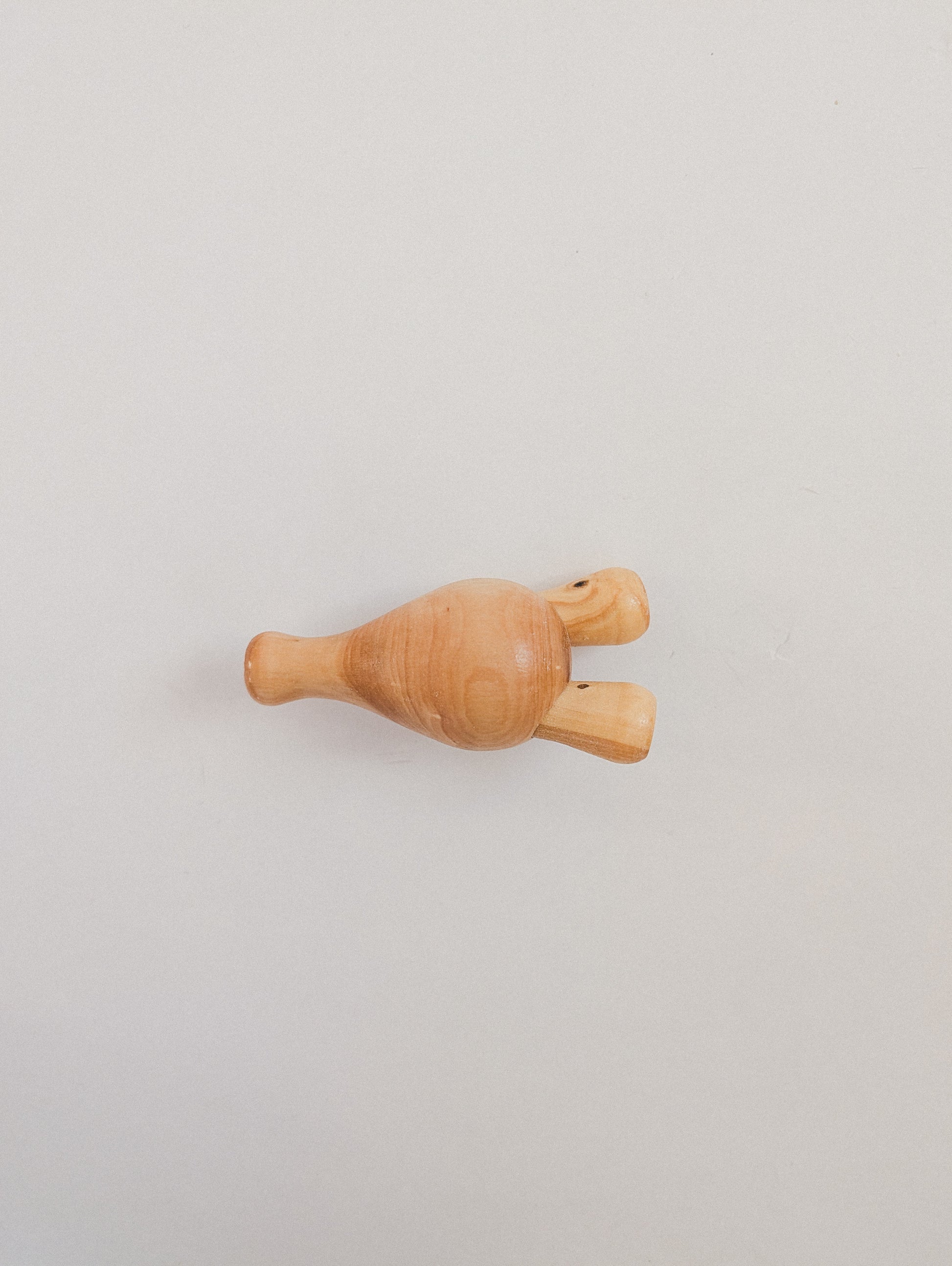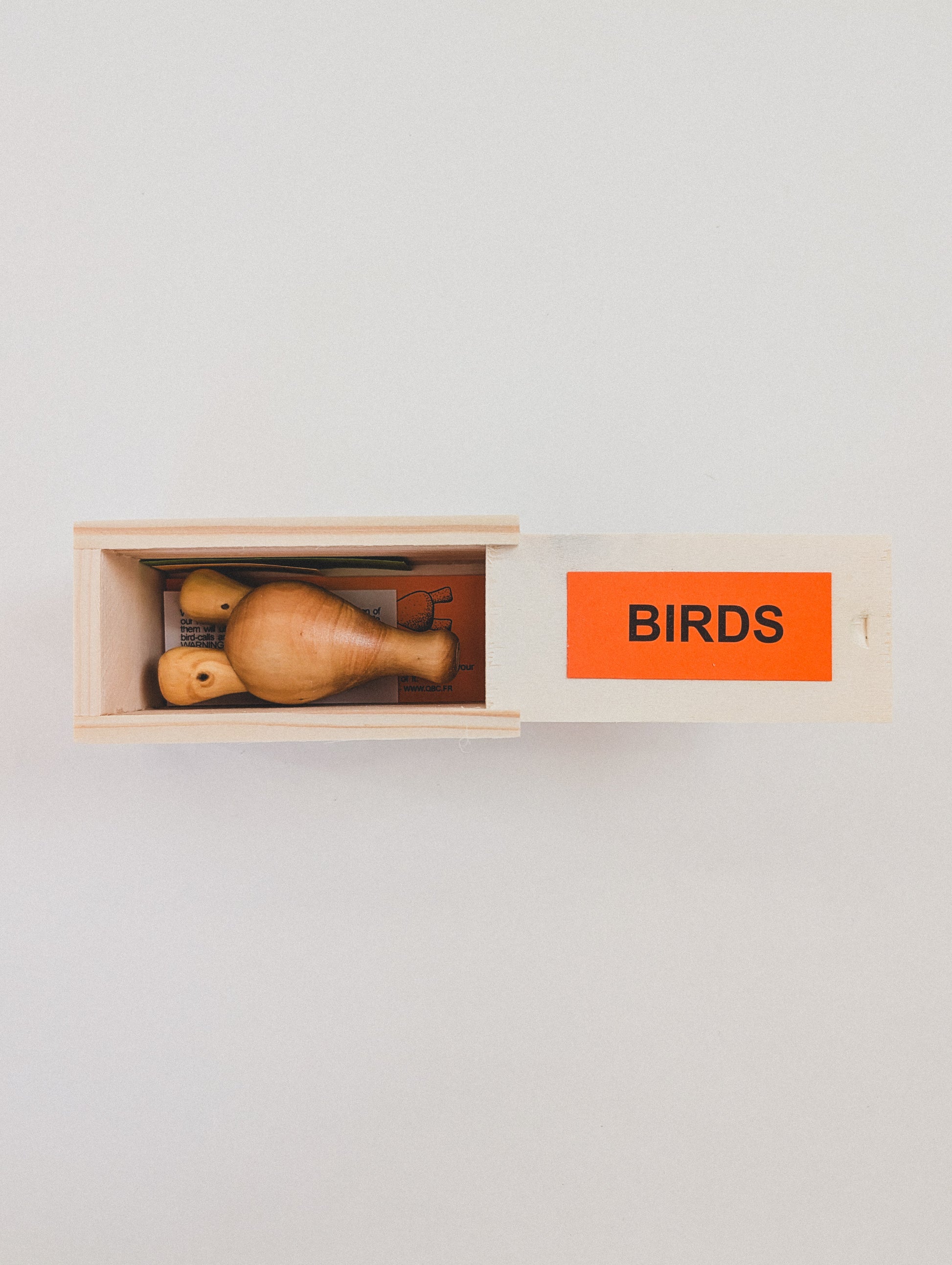 To play: hold the bird call between the thumb and the two smaller fingers. Blow in short, quick bursts while lightly turning the tongue. With the index and middle fingers, gently open and close the ends to create a more fluid, trilling “chirp”, bright and musical.