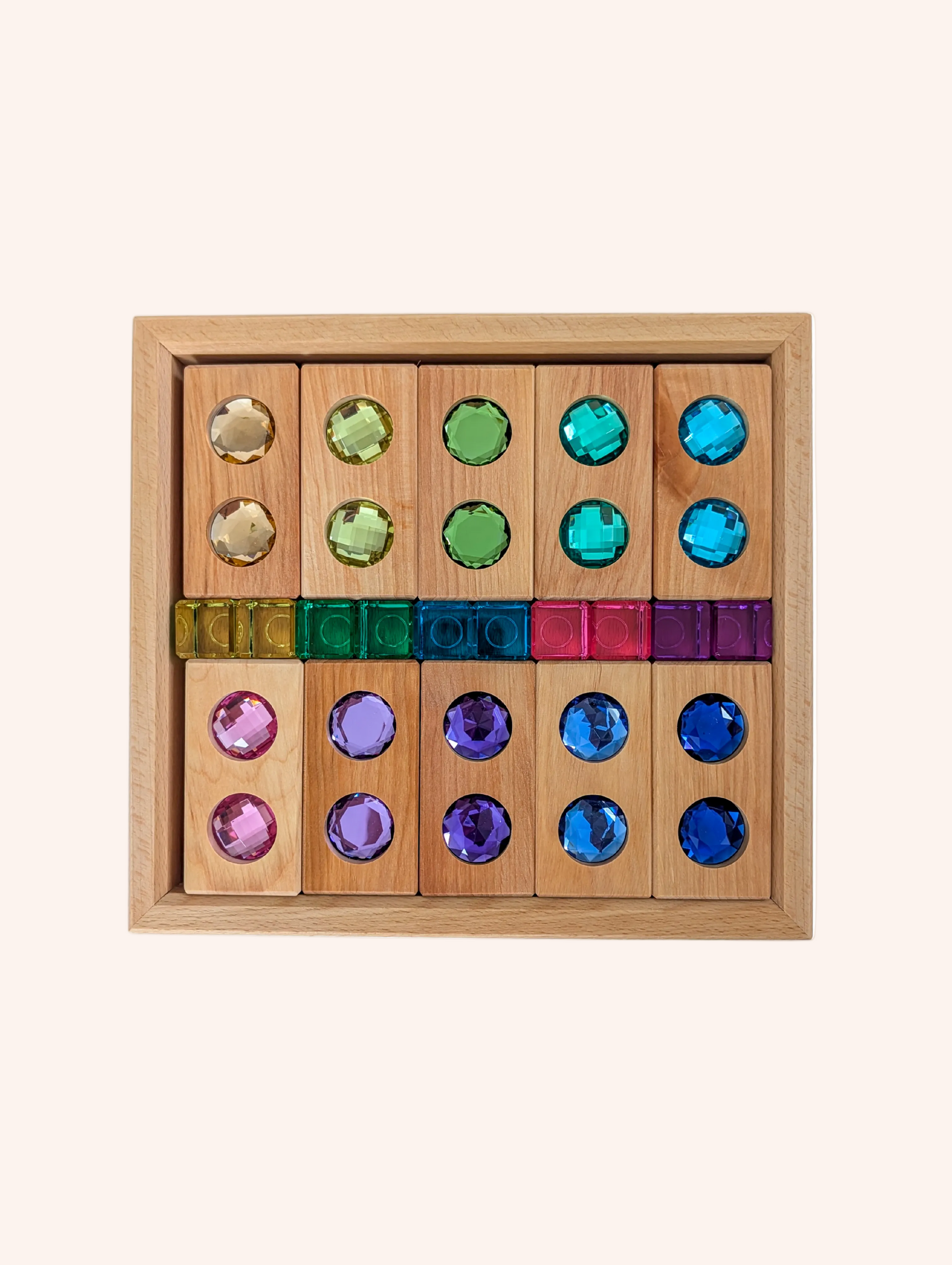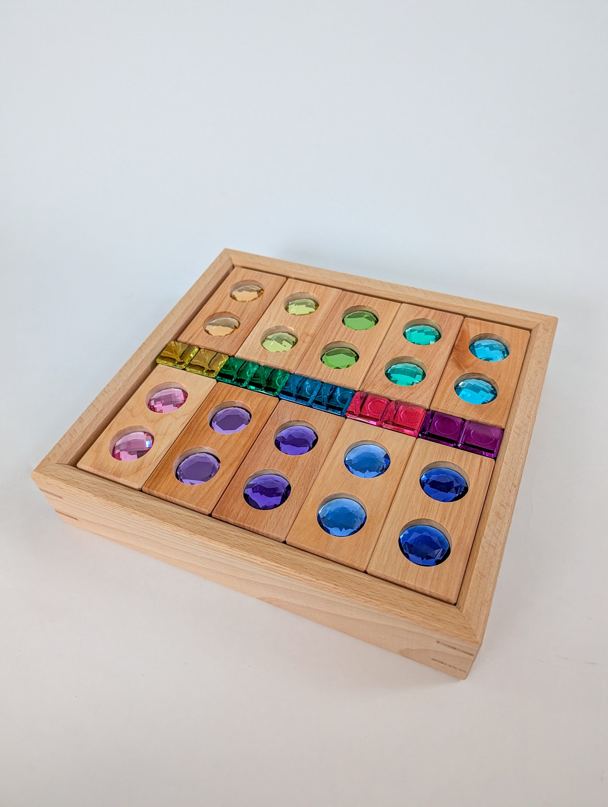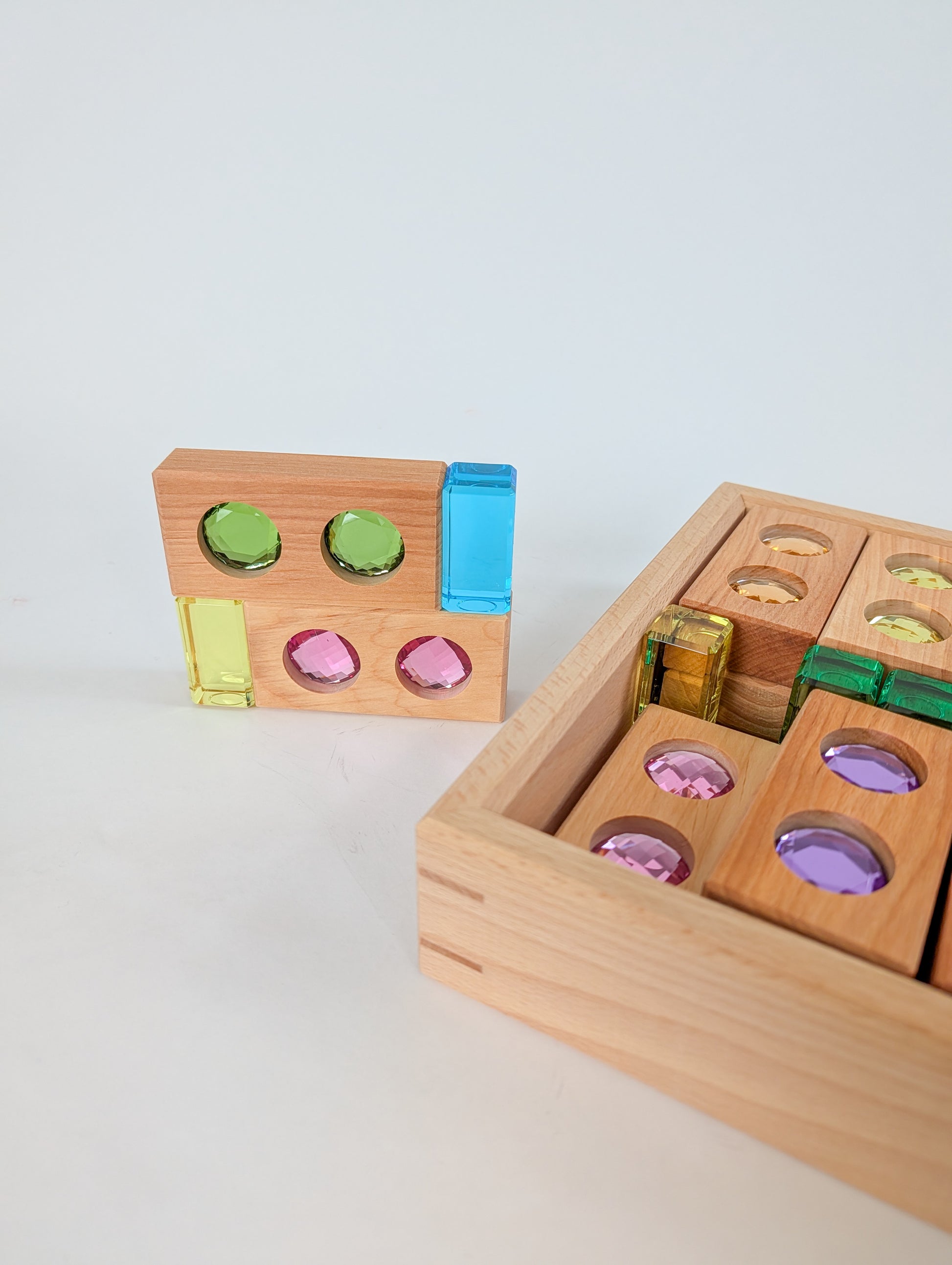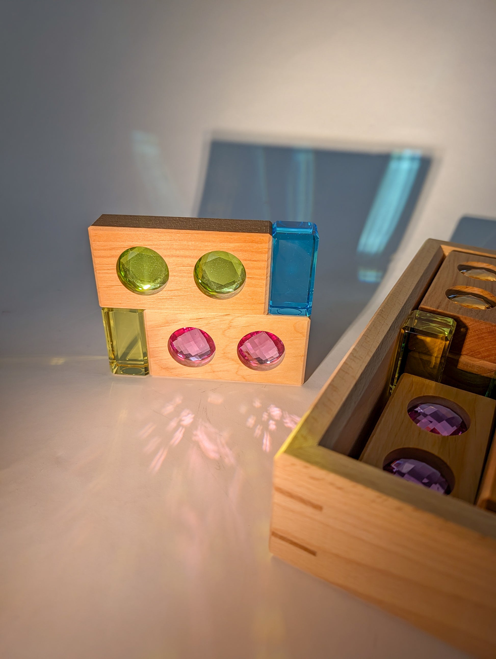 Children can explore the rhythm of color, build glowing paths and structures, or create small worlds filled with soft brilliance. The calming pastel tones bring a sense of harmony and balance, while the natural wood offers warmth and grounding.