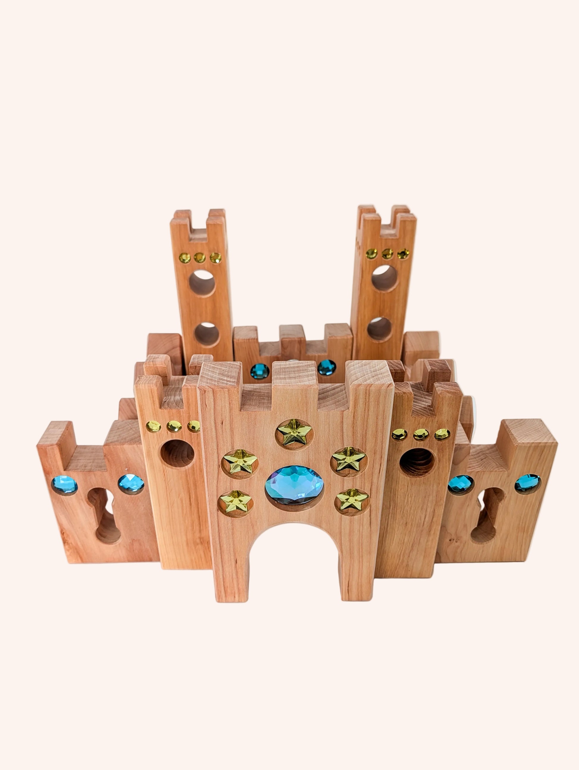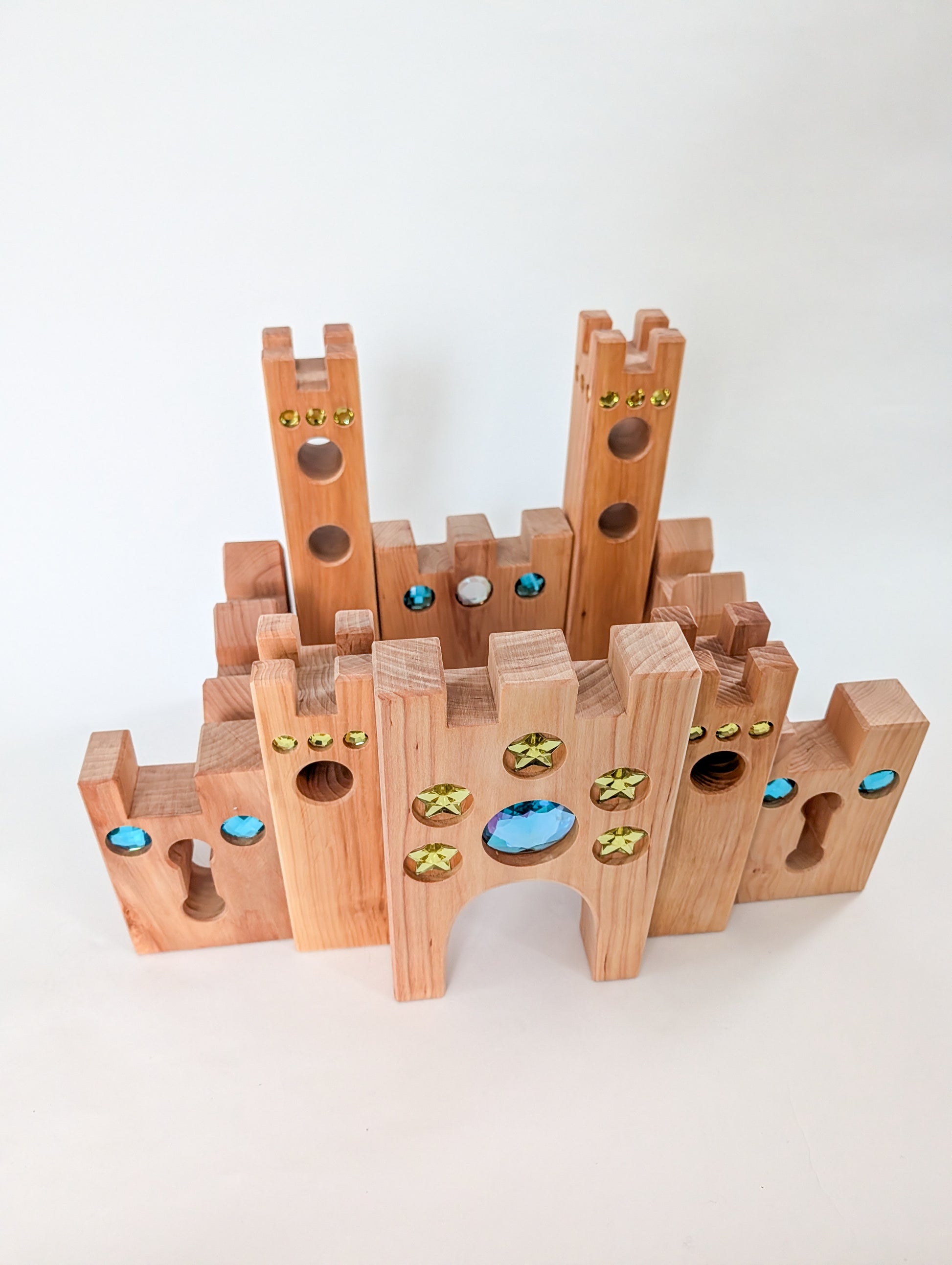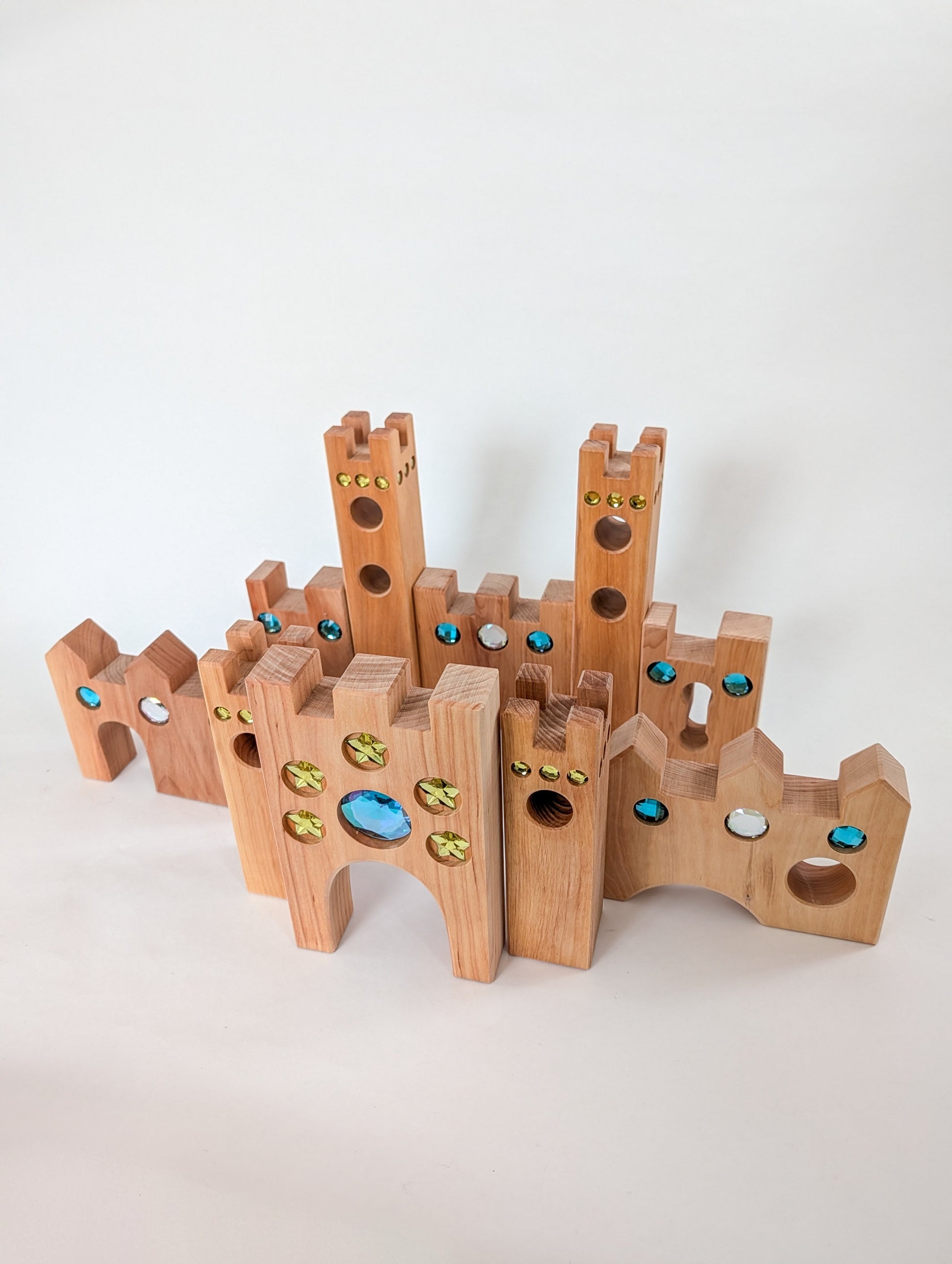Set includes 10 solid wood castle pieces with inset acrylic gems