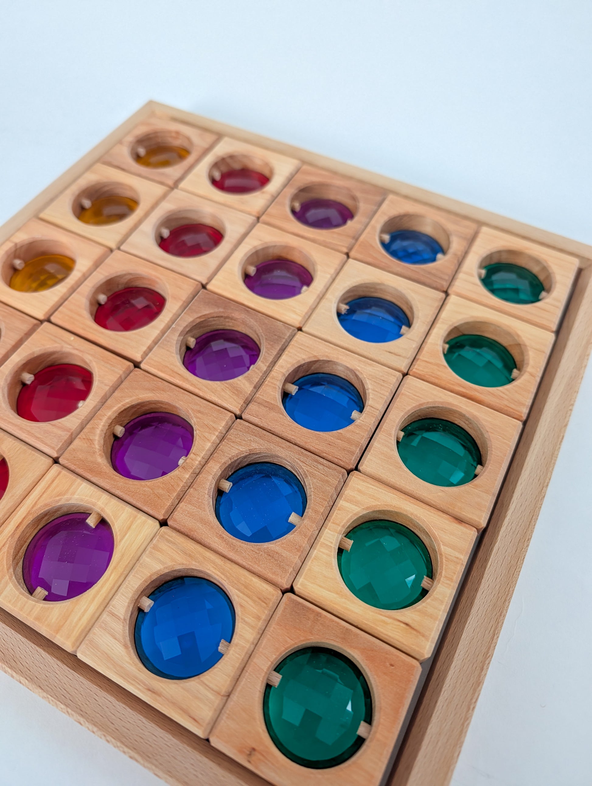 Set includes 25 solid wood cubes with inset acrylic gems, stored in a wooden tray