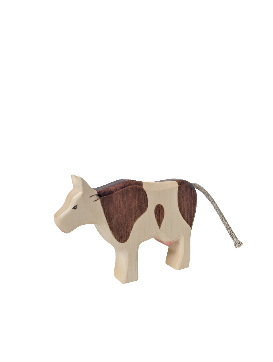 This lovable farm dweller loves to spend the whole day in the pasture, grazing on grass and herbs, or walking with her young. She has light fur with brown cow spots, pricked ears, and an attentively raised head, checking on her offspring.