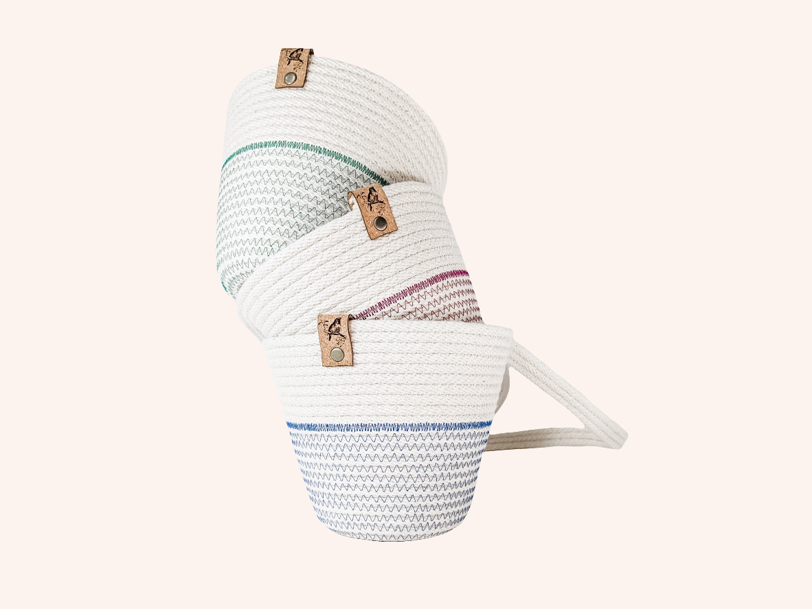 Part of a mom + me set, to free those little hands while exploring or harvesting. From collecting shells to picking berries. Because mom and dad's pockets are only so big!
