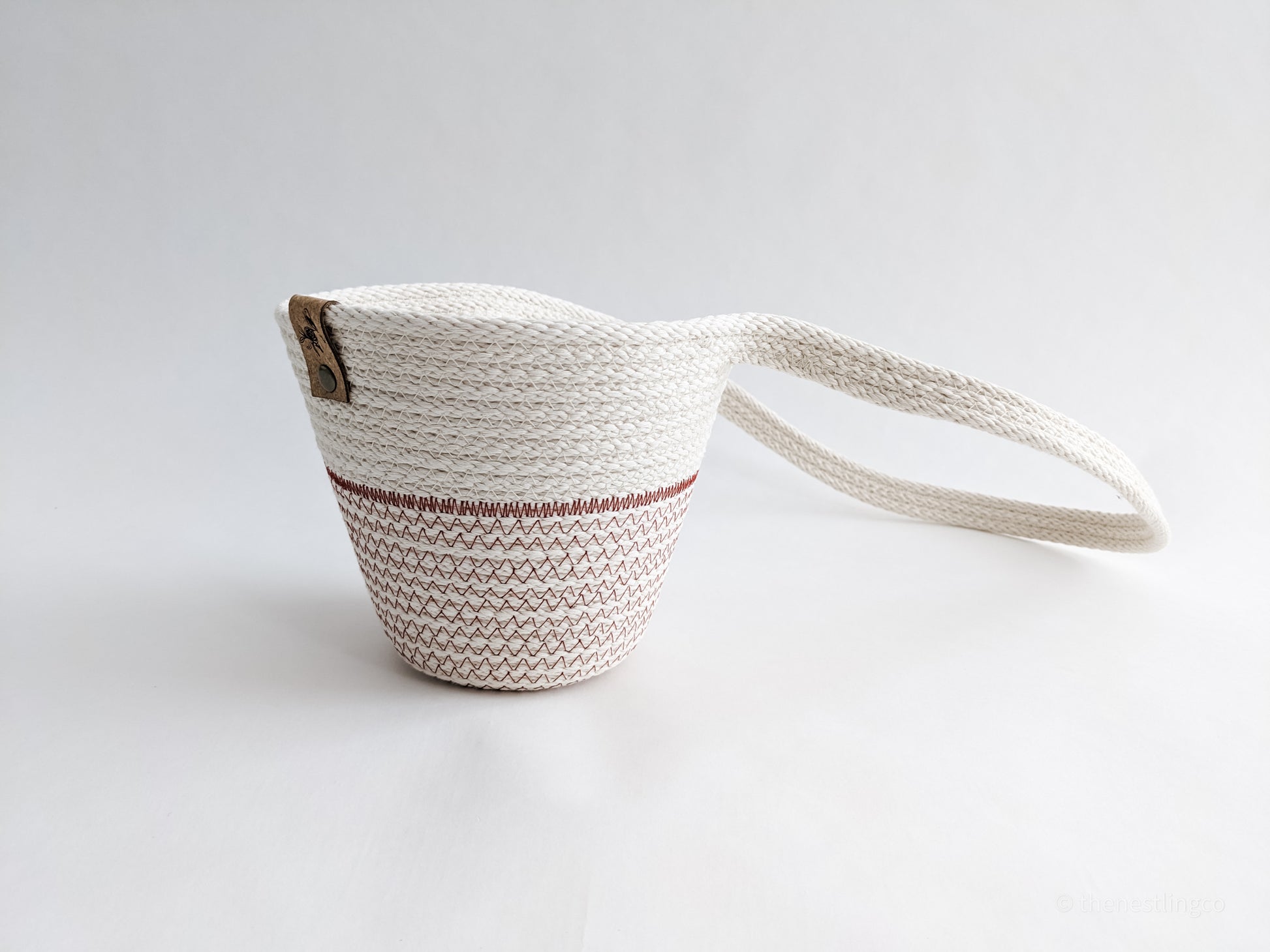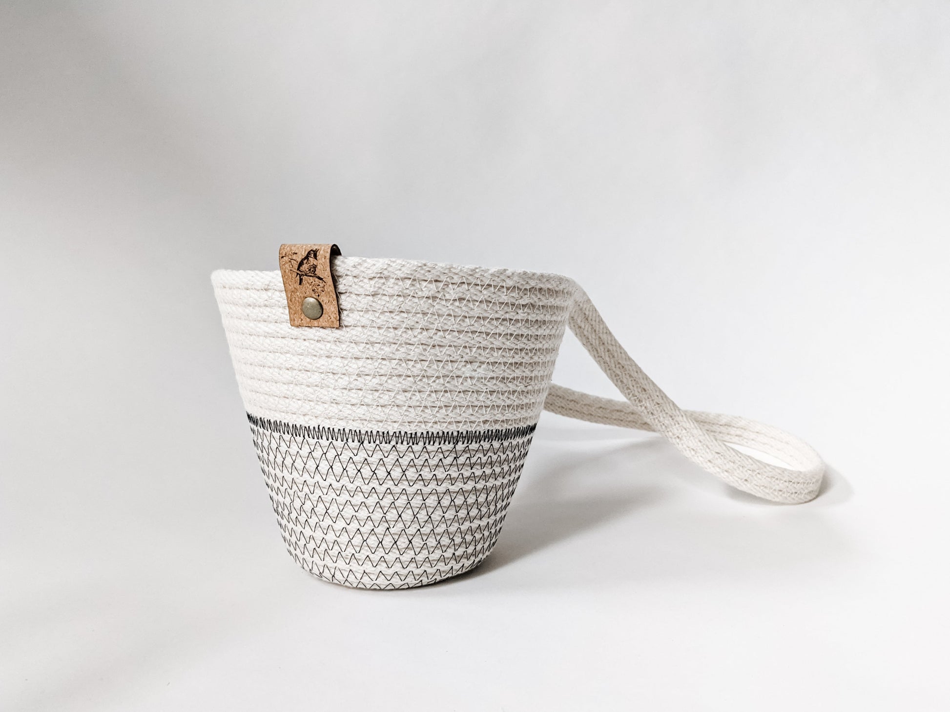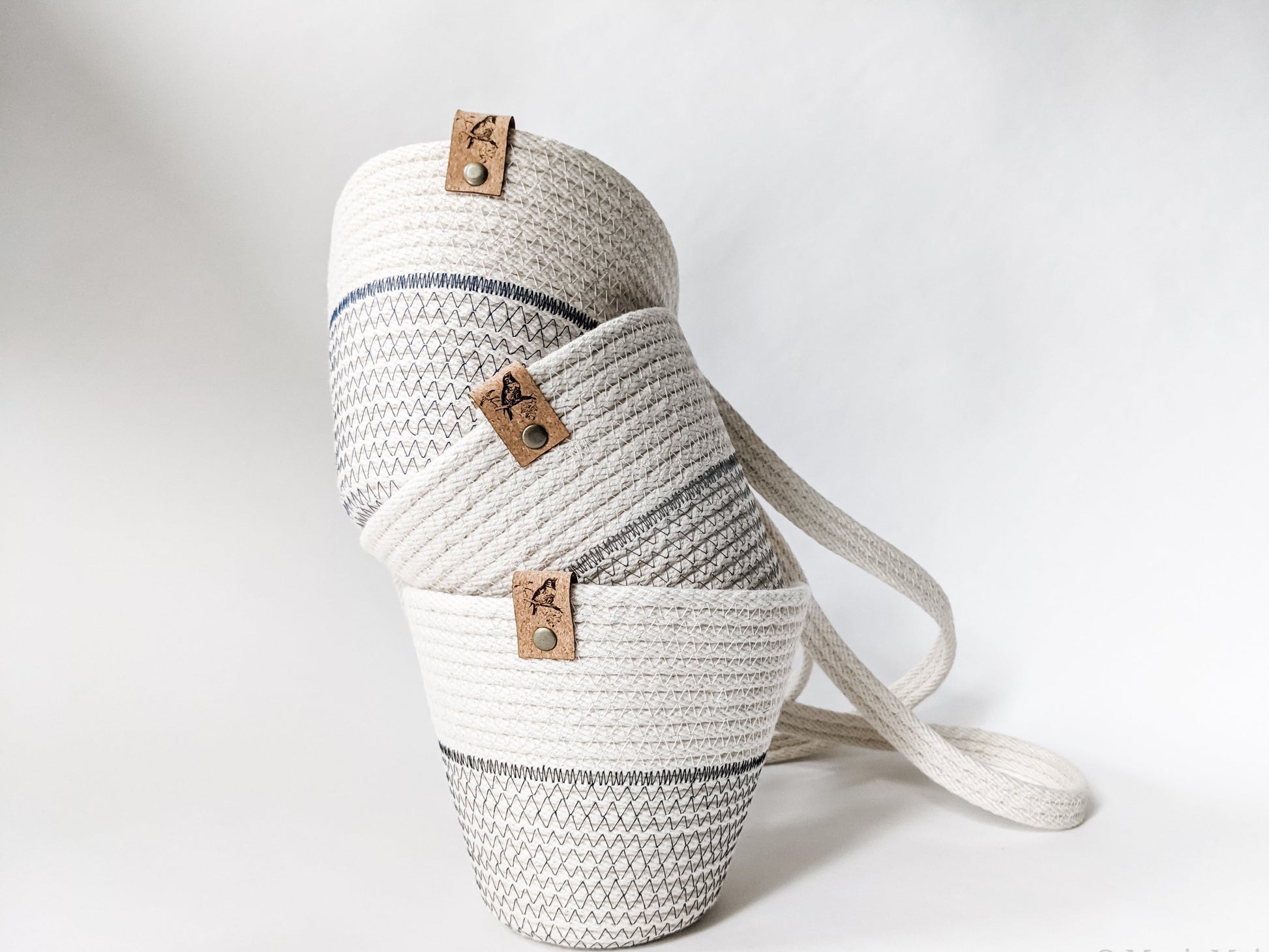 This basket was constructed on a sewing machine, coiled by hand, using 100% cotton rope and thread. It is finished off with a cork tag.