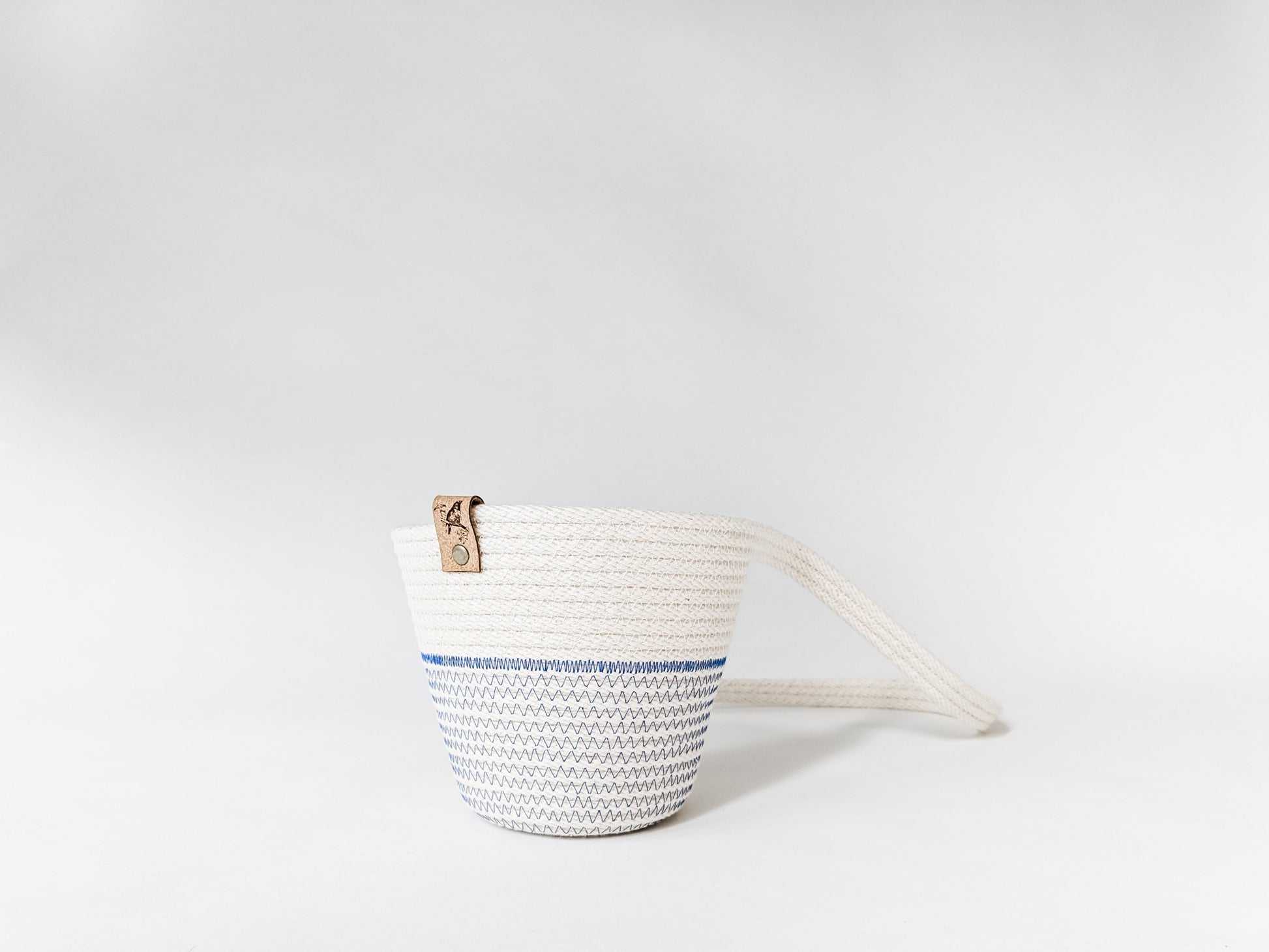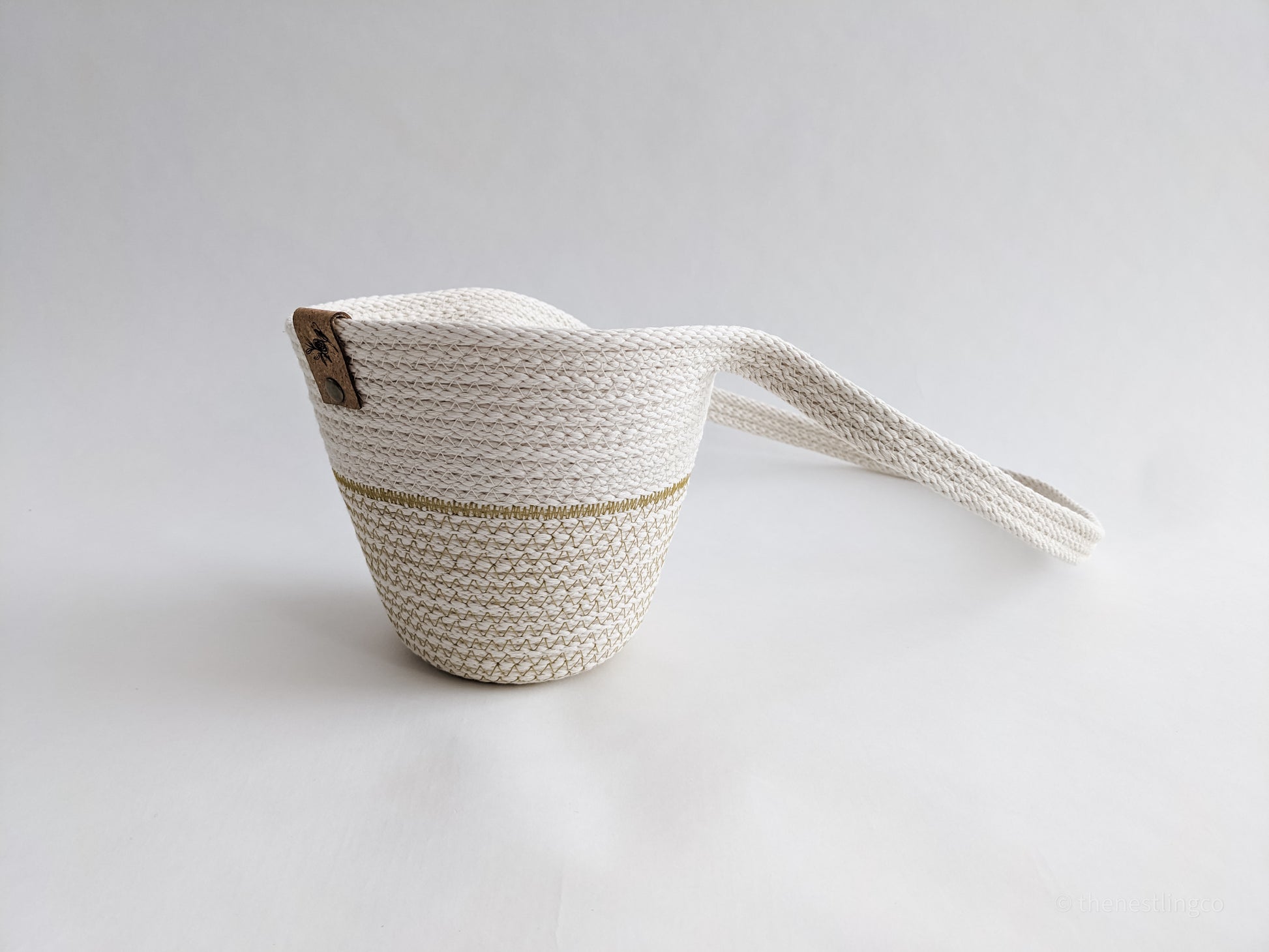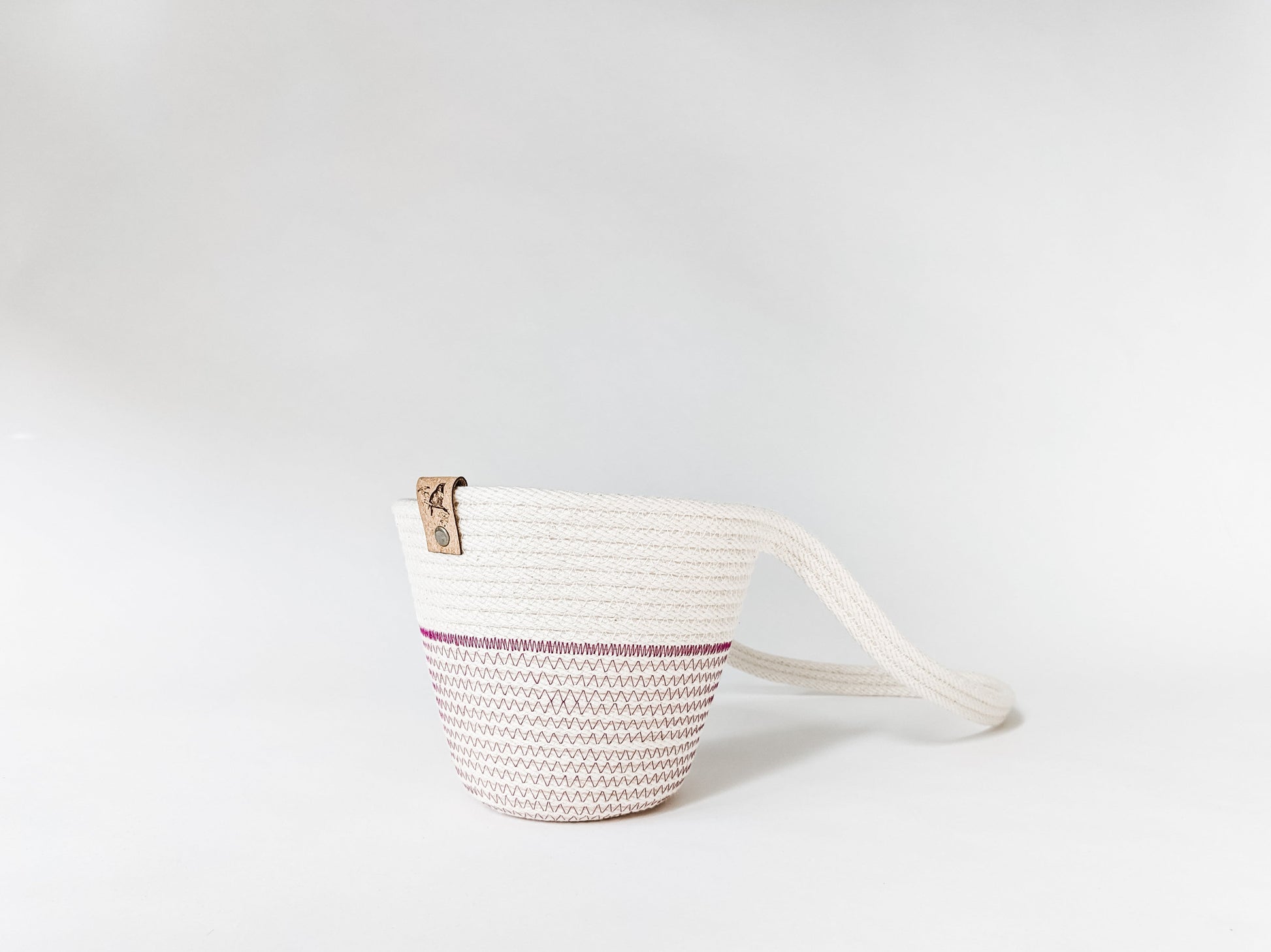 This basket was constructed on a sewing machine, coiled by hand, using 100% cotton rope and thread. It is finished off with a cork tag.