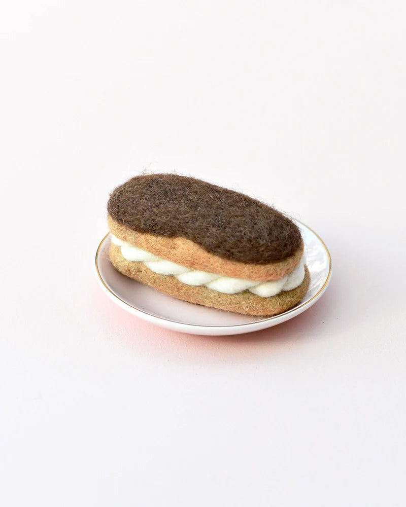 This listing is for 1 chocolate eclair. Each chocolate eclair has been meticulously needle-felted with dense wool that has been dyed with non-toxic colours, making it safe for play.