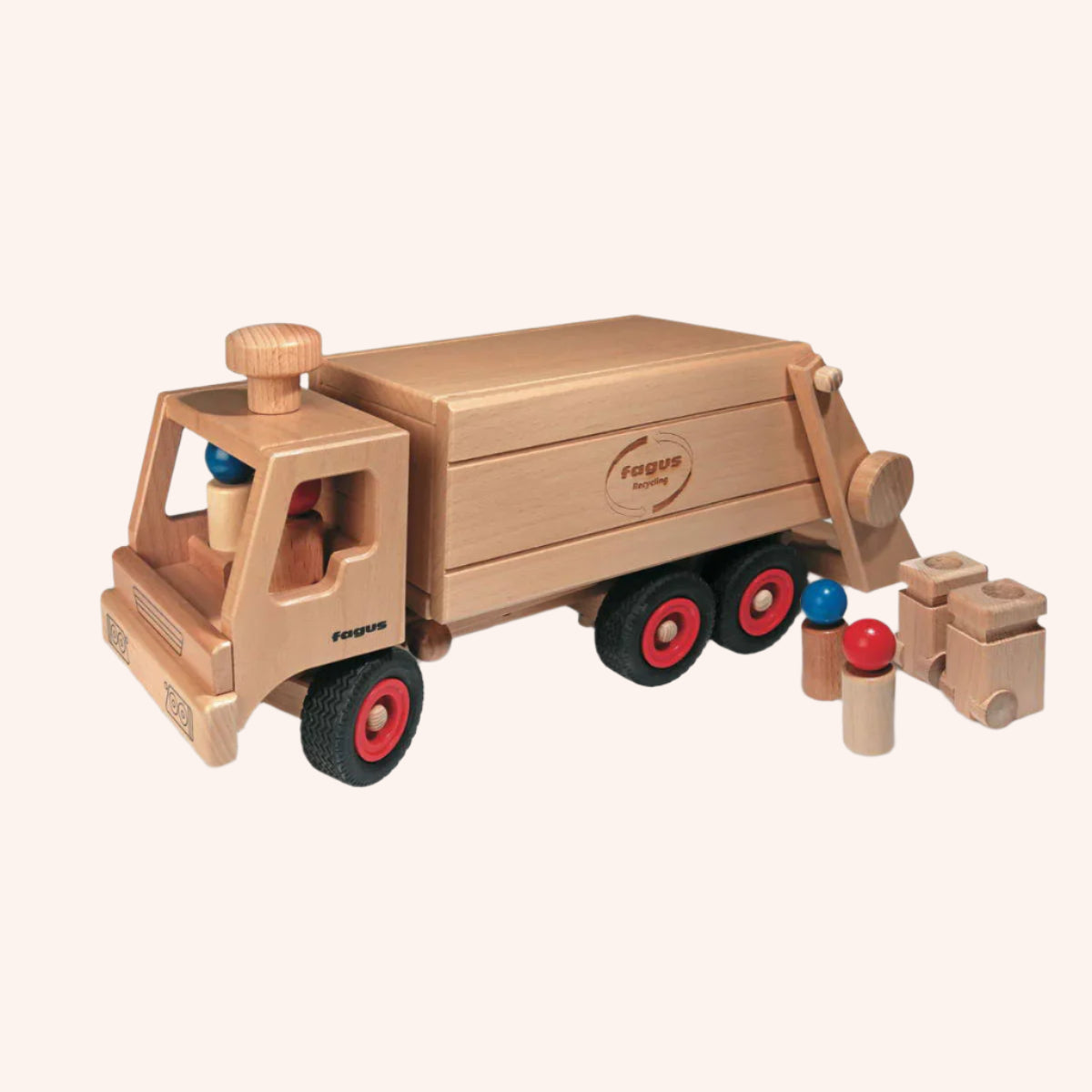 A wooden toy garbage truck from Fagus. Children will love to play with the familiar garbage truck, with two garbage bins that can be lifted and tilted into the truck's back. With peg people for added play.