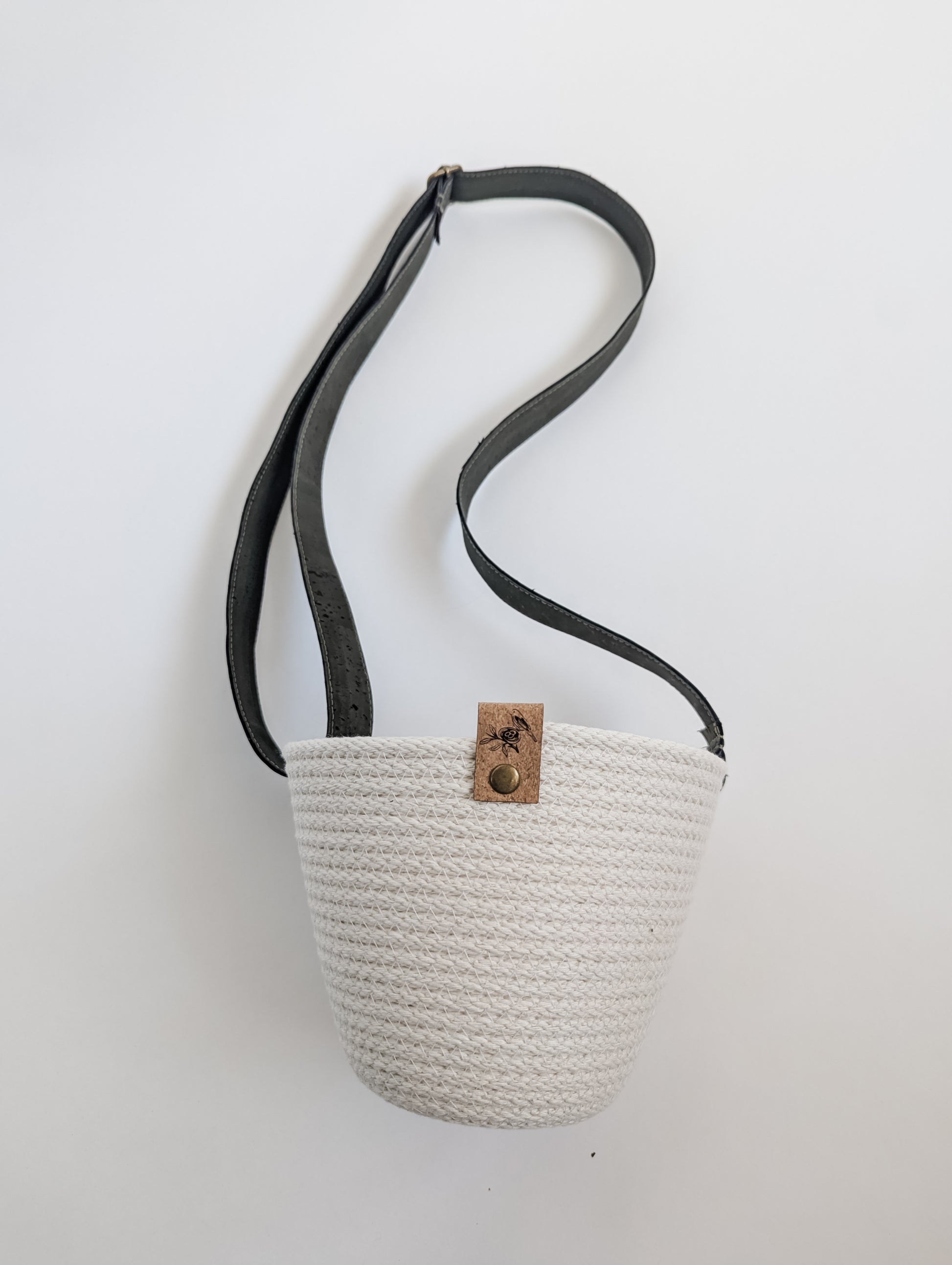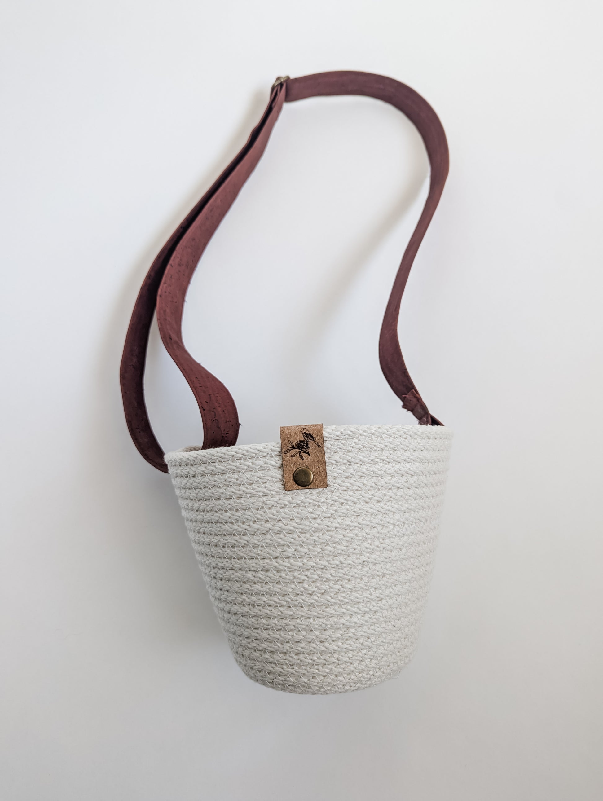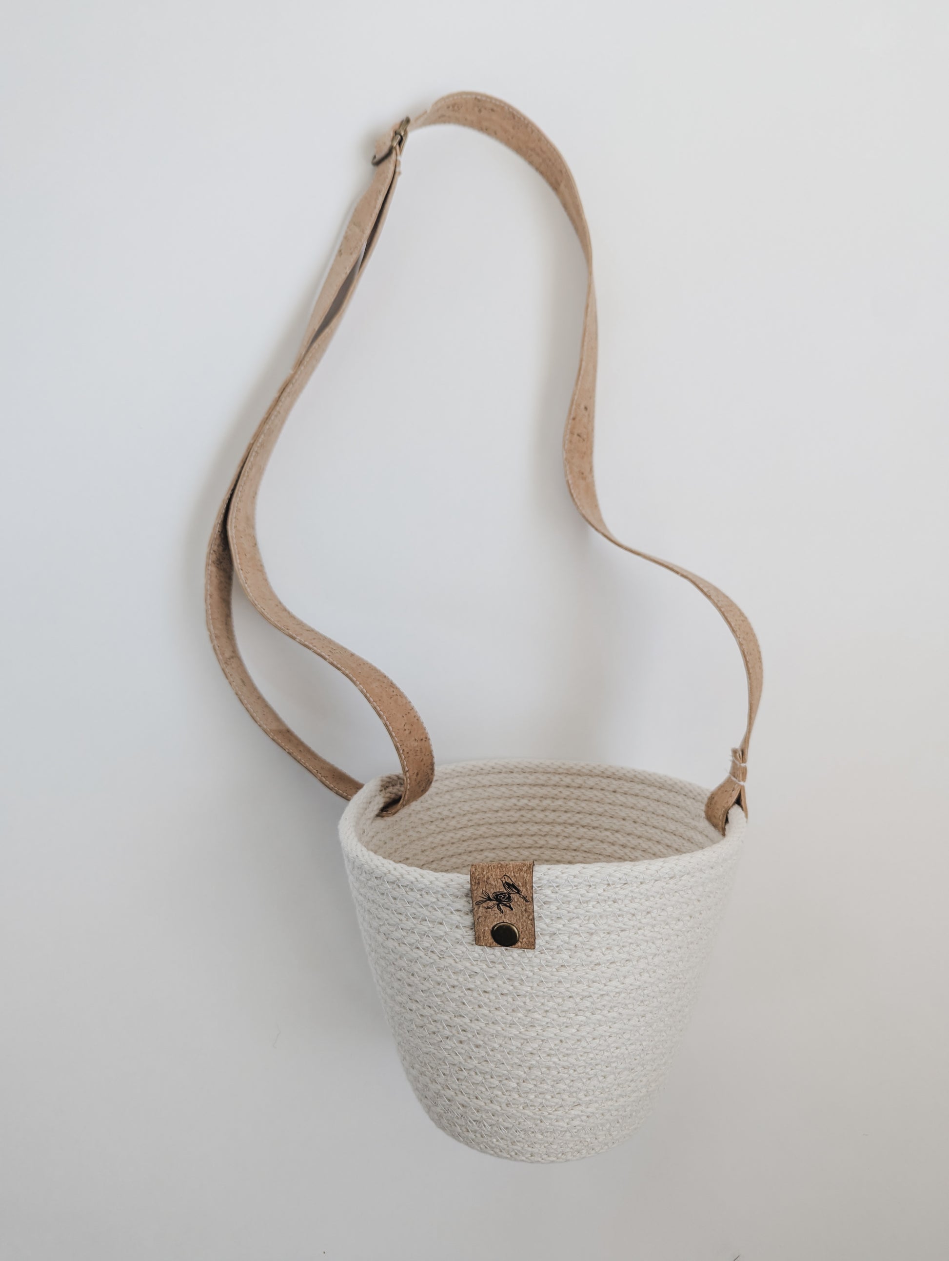 Coiled by hand and machine-stitched using 100% cotton rope, it features a soft, adjustable strap made from eco-friendly Portuguese cork and a signature cork tag for a natural finish.