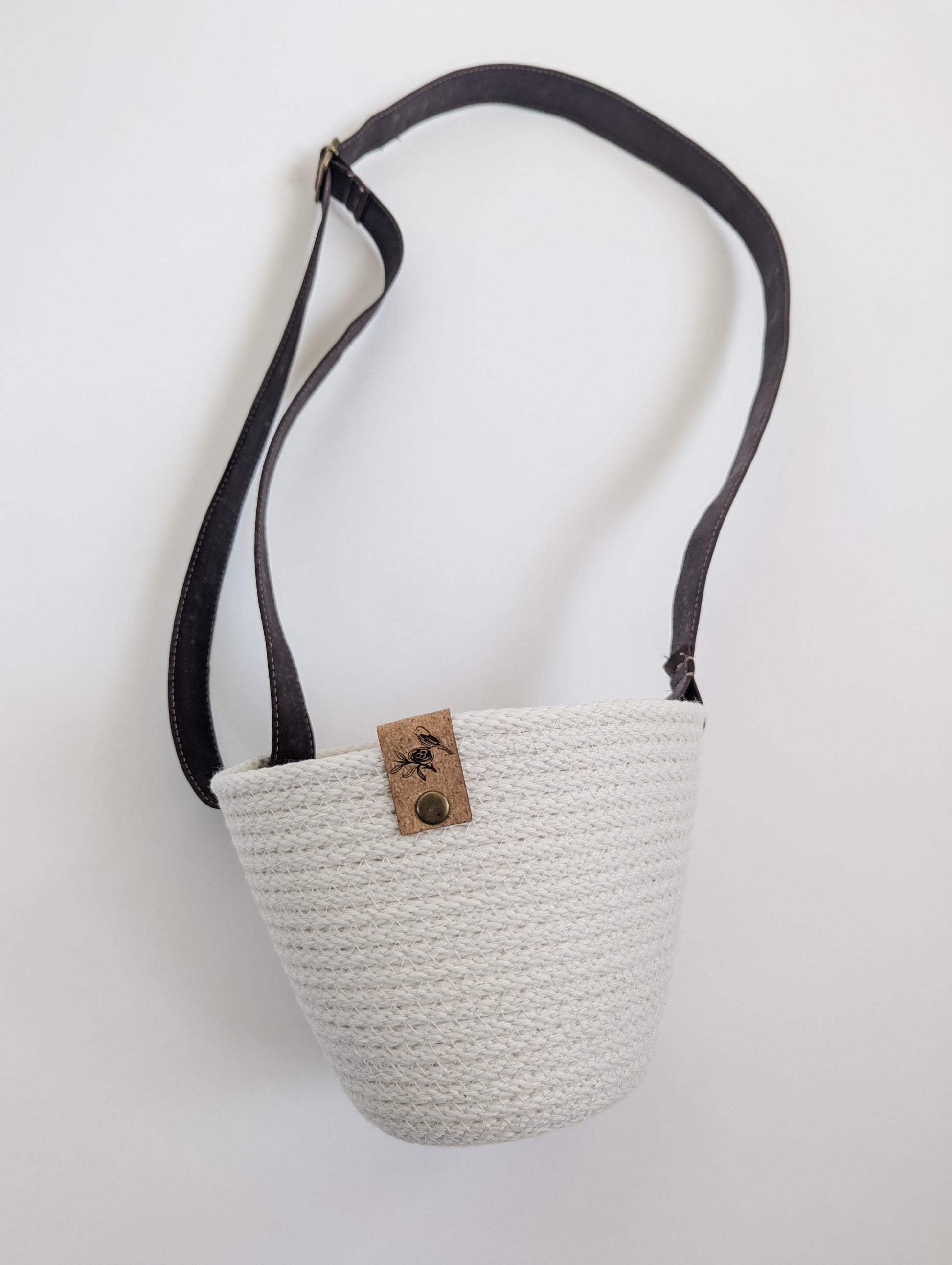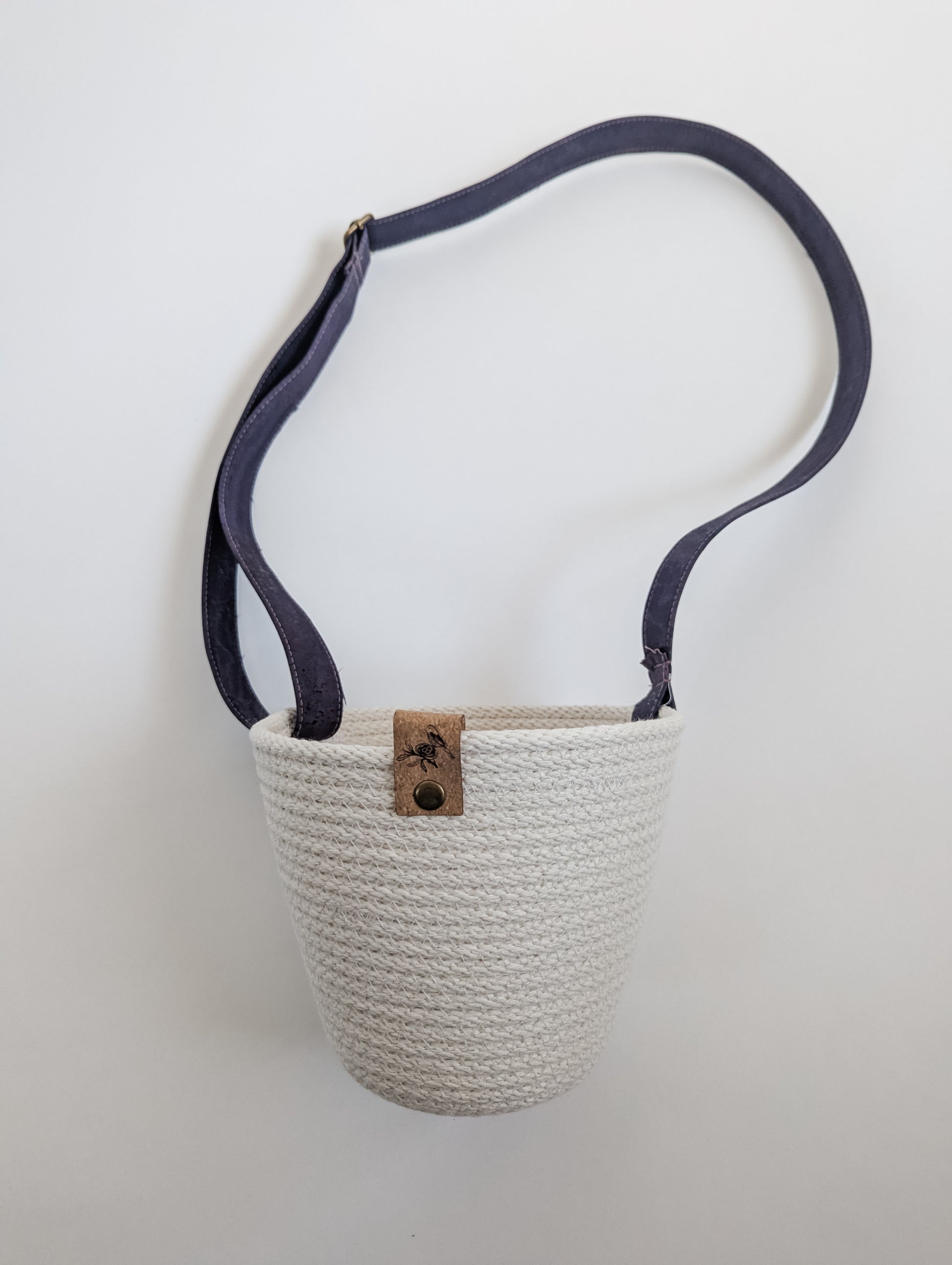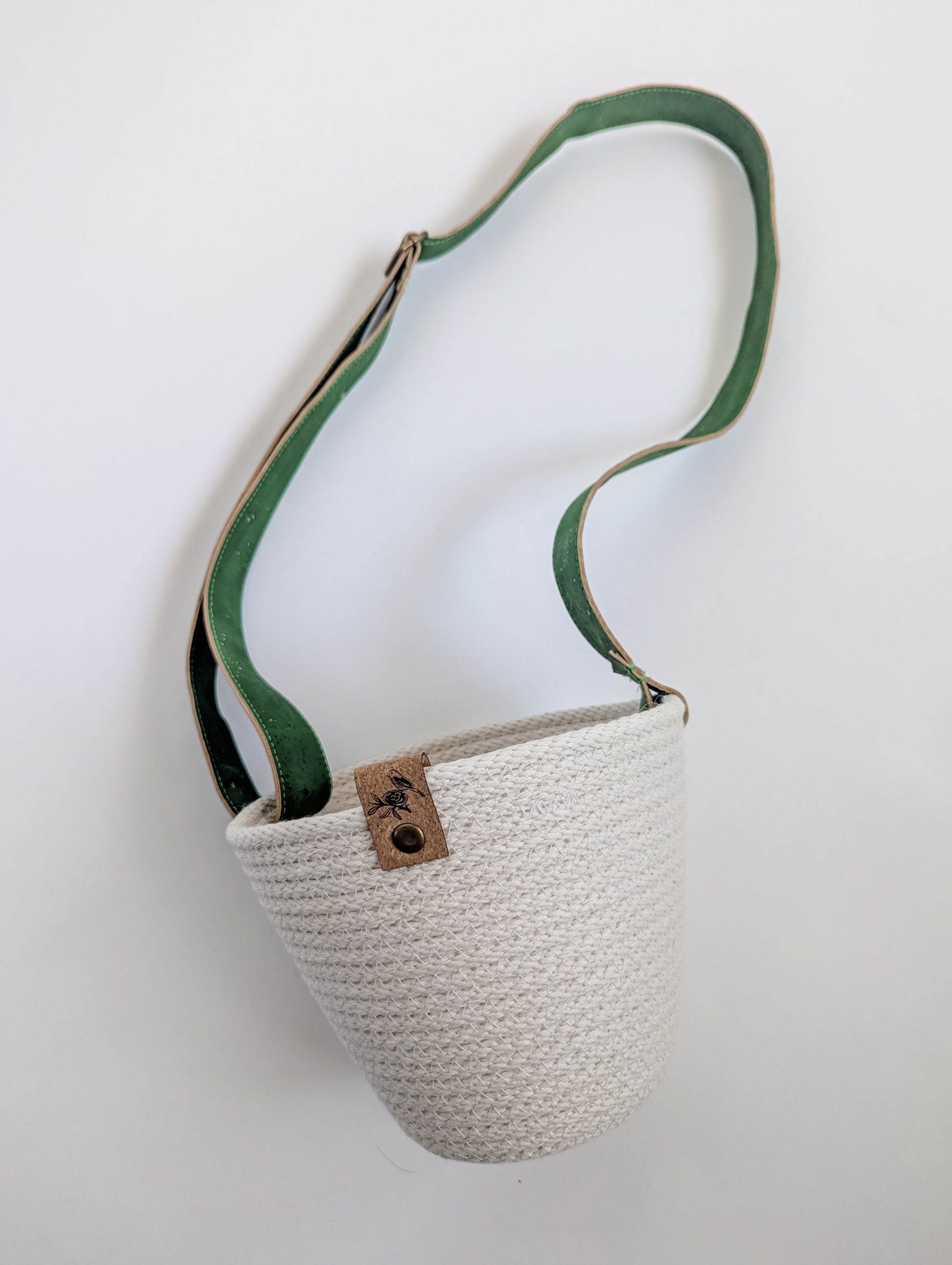 Coiled by hand and machine-stitched using 100% cotton rope, it features a soft, adjustable strap made from eco-friendly Portuguese cork and a signature cork tag for a natural finish.