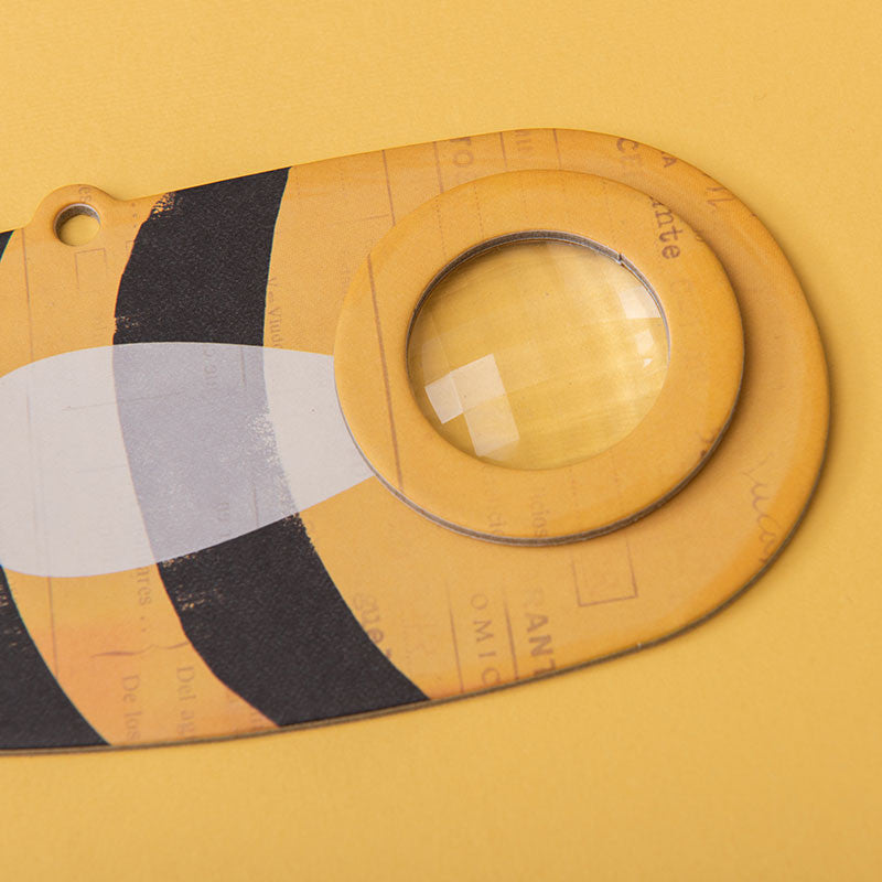 An optic eye lens in a bee illustration to let you see like an insect. A small kaleidoscope ideal for travel entertainment and as a gift. Made in Europe.