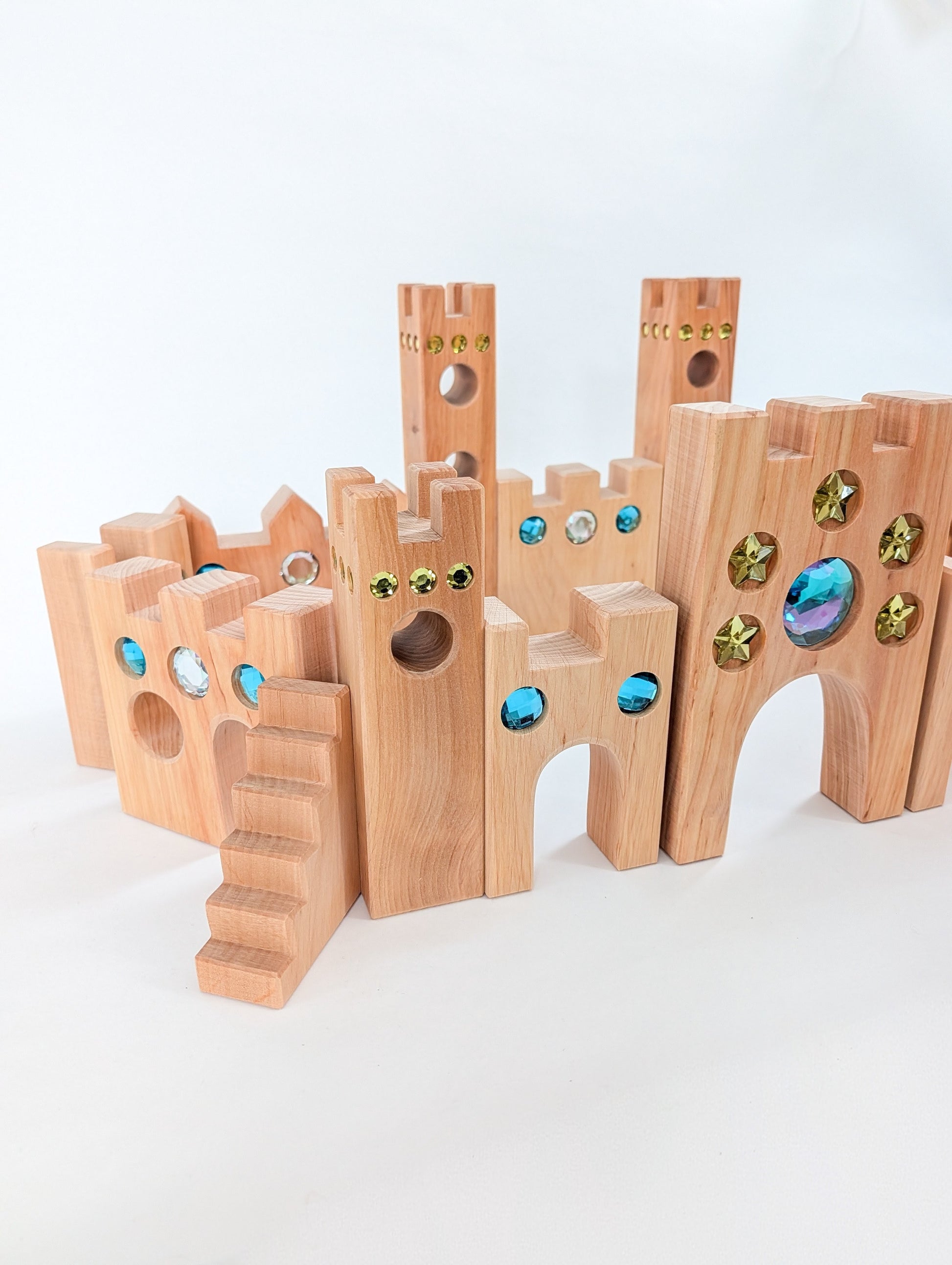 Set includes 16 solid wood castle pieces with inset acrylic gems