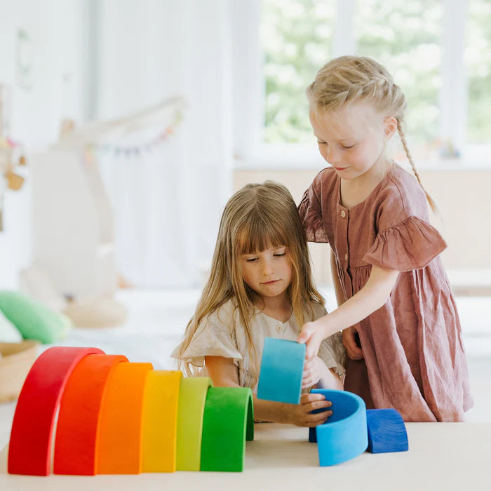 This 12-piece Large Rainbow is an incredibly versatile, open-ended toy. It can be used as a stacking toy with endless combinations, built into tunnels for cars and animals, houses for dolls, or even played with as a marble run alongside rainbow balls, limited only by your child’s imagination.