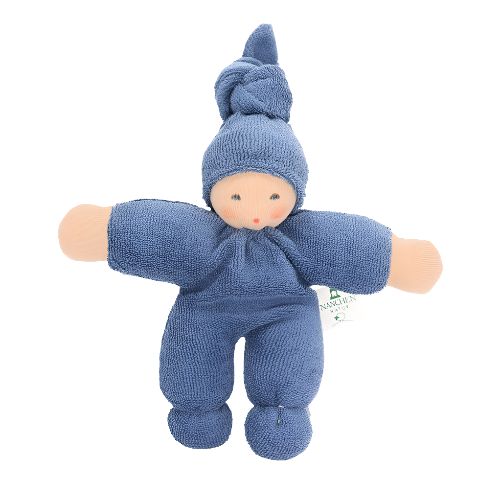 Soft, cheerful, and perfect for little hands, Little Blue is a cuddly first doll for babies and toddlers. Handmade in Germany by Nanchen Nature, she is crafted from organic cotton velour and filled with pure organic wool - safe, natural materials ideal for snuggling and gentle play.
