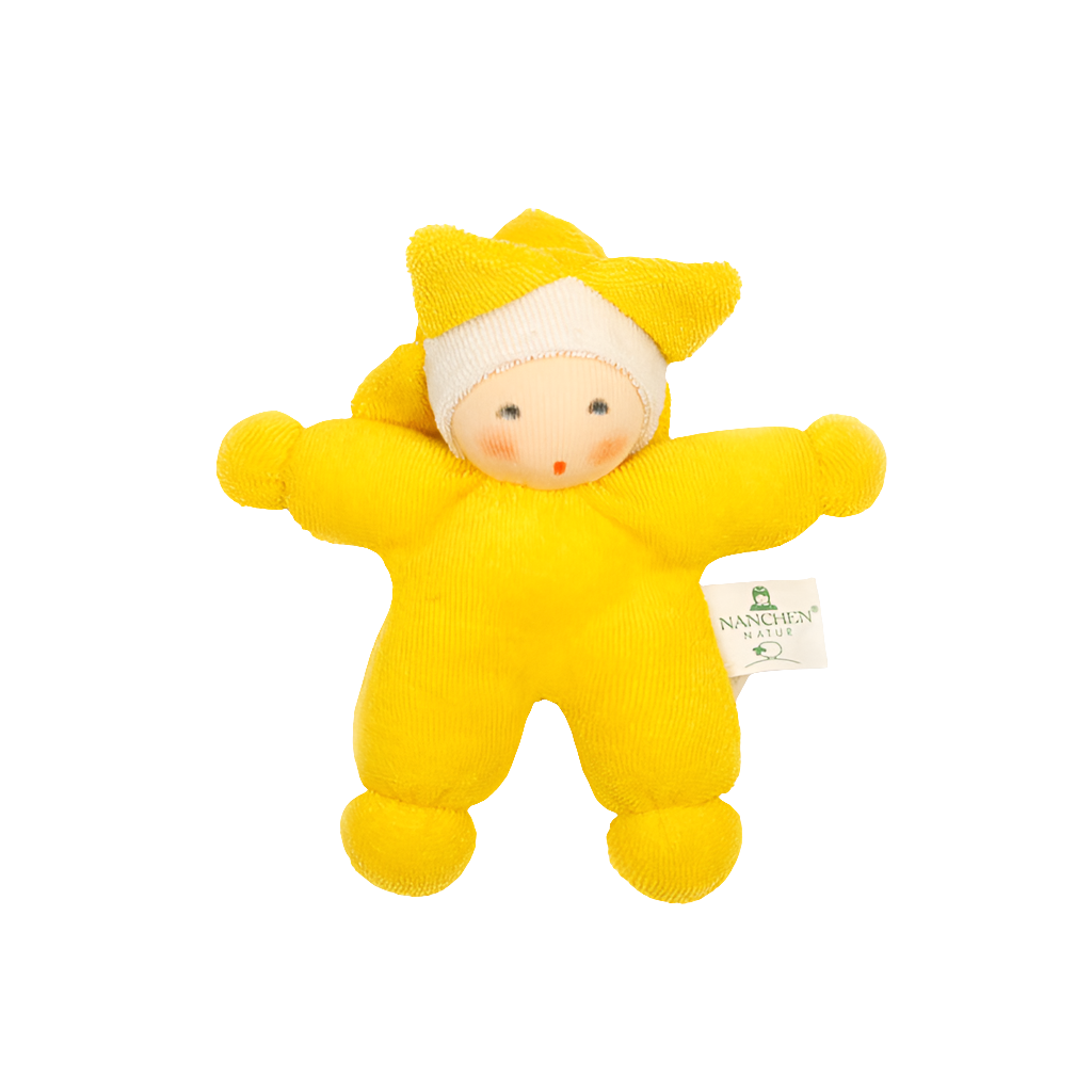 A twinkling little friend for the youngest dreamers, the Sternlein Baby is soft, soothing, and easy for tiny hands to hold. Handmade in Germany by Nanchen Nature, this star-shaped doll is crafted from organic cotton velour and filled with pure organic wool—safe, natural materials perfect for babies and toddlers.