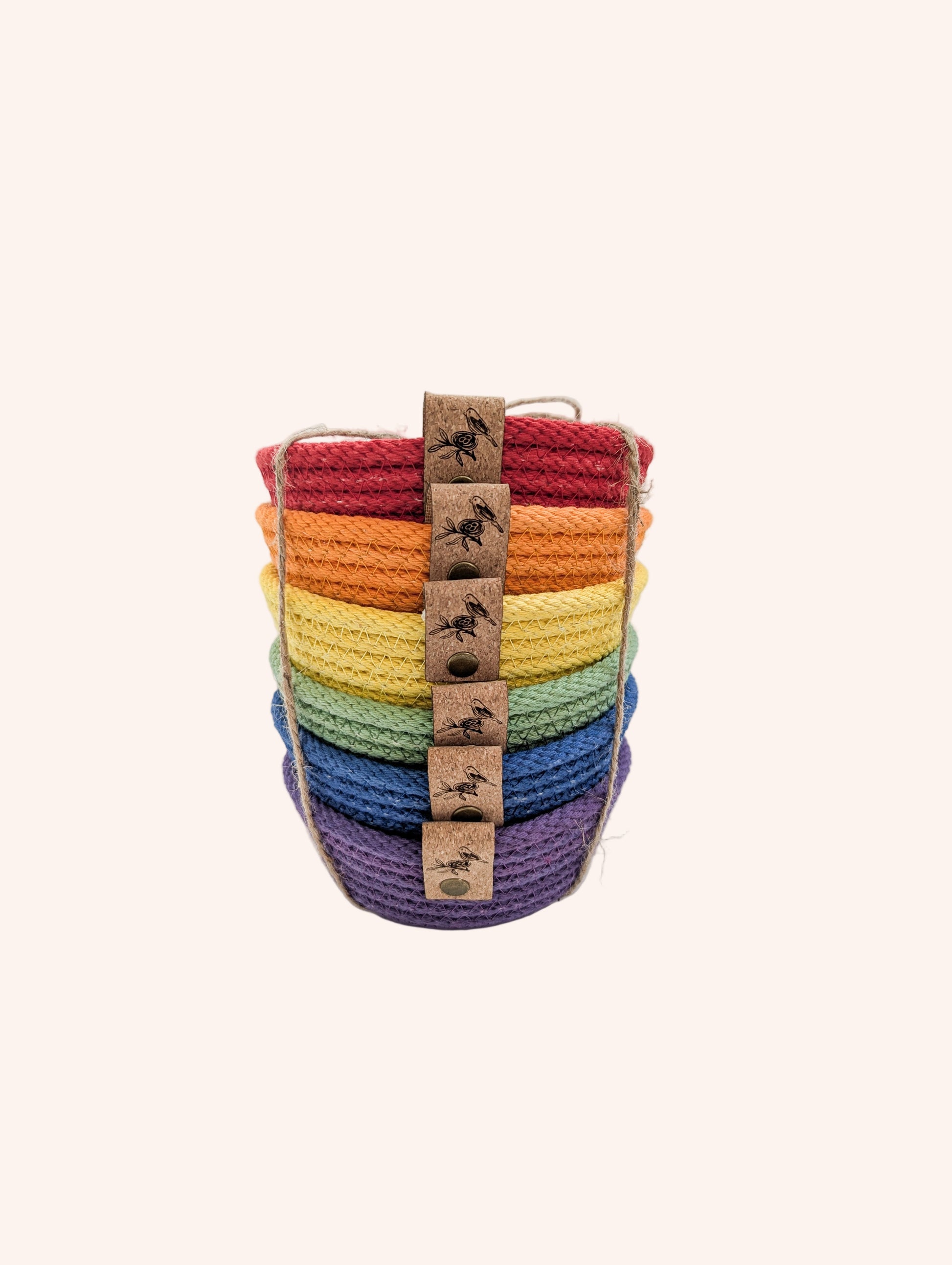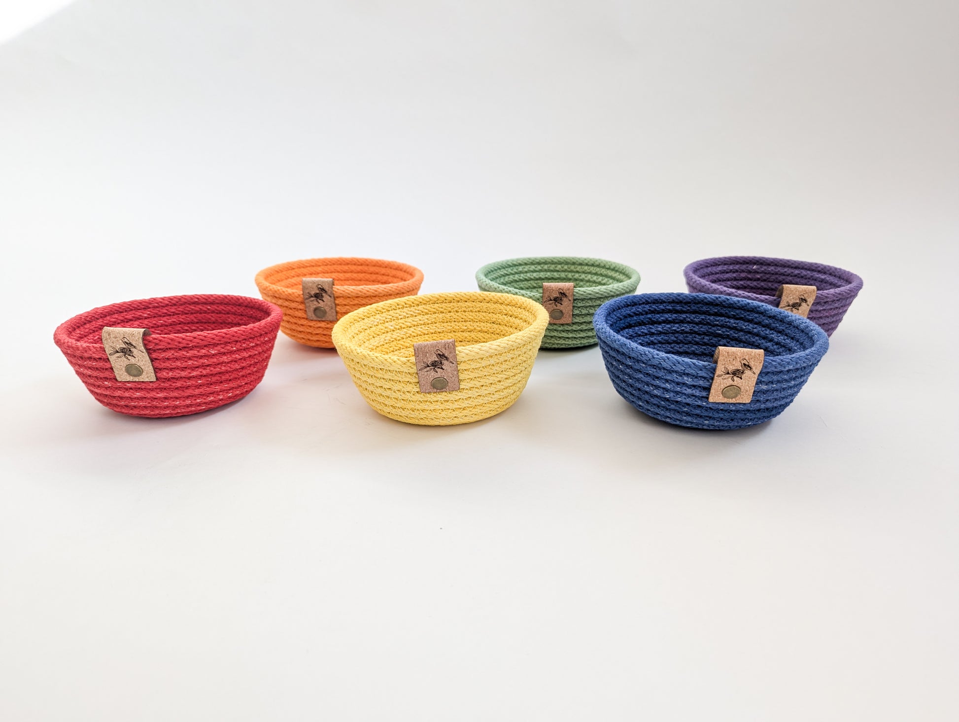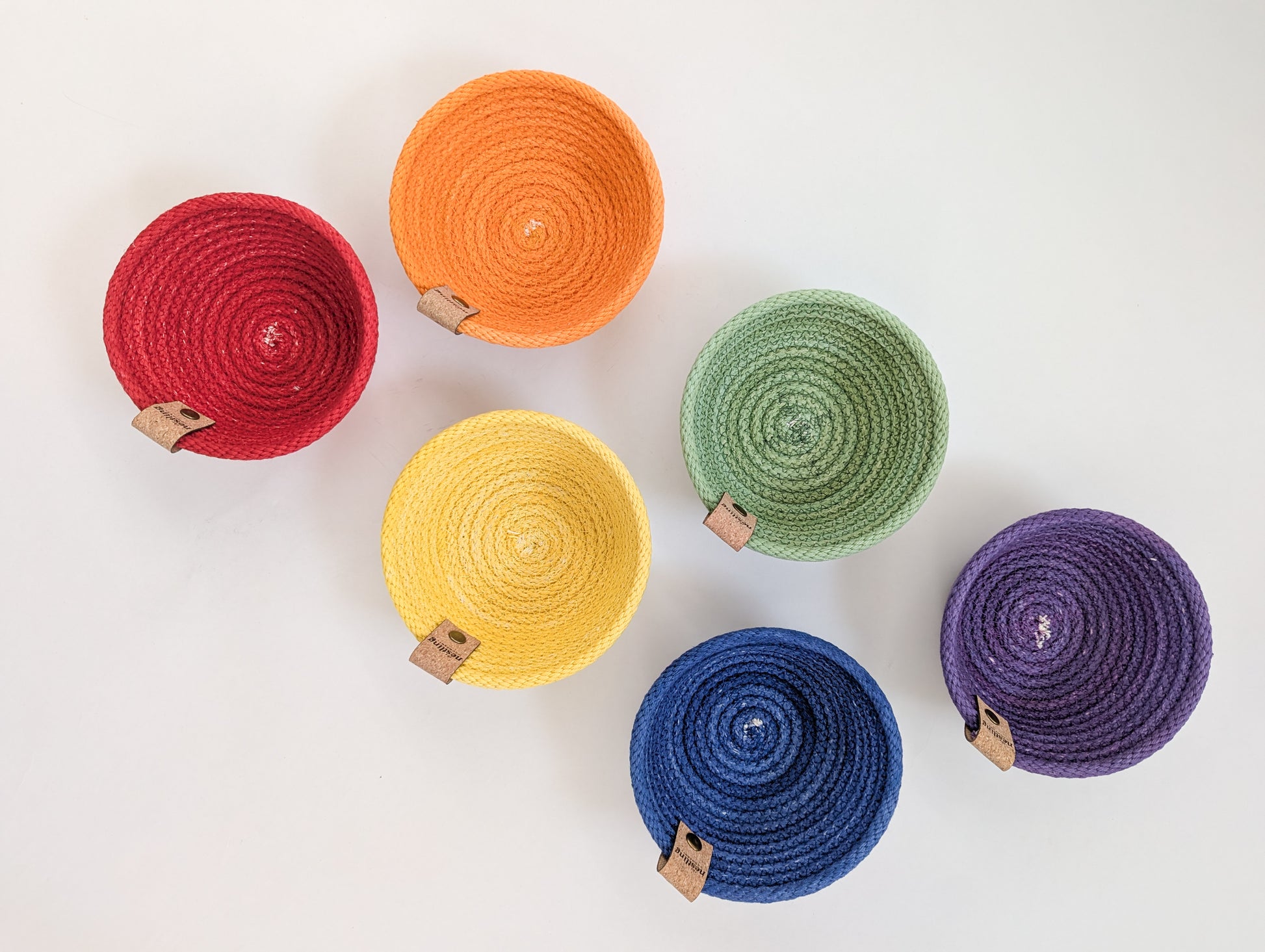 A cheerful little collection of handmade rope bowls in rainbow hues: red, orange, yellow, green, blue, and purple.