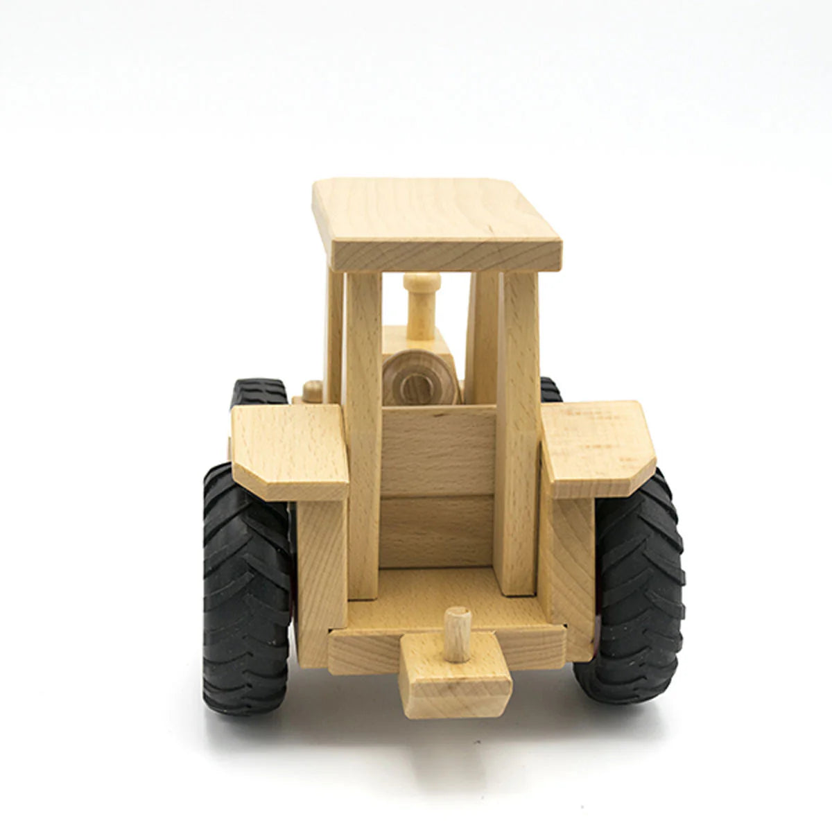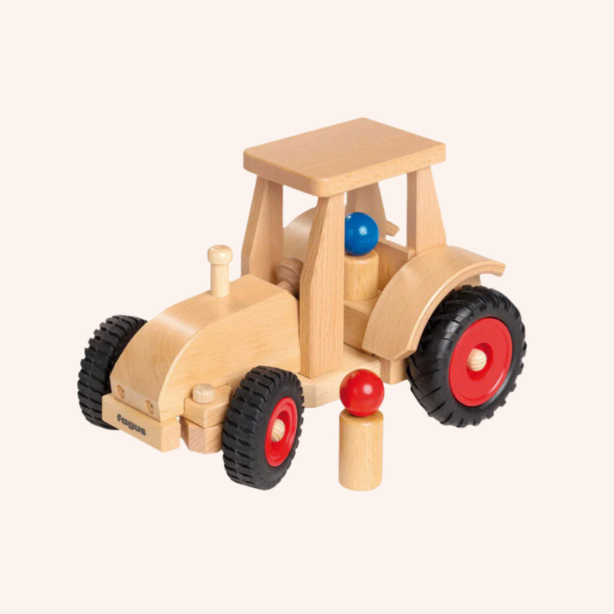 A new wooden tractor with a modern look. Young hands can grasp the roof of the cab, and by pushing in the intended direction, steer the wheels. Sturdy and well-made, just as you'd expect from Fagus, and with many great attachments for farm use. Two figures are included.