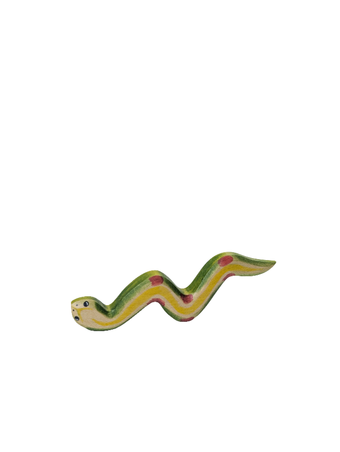The colorful Holzwald Snake has green-yellow snake skin with red spots on its sides. It loves to slither through the grass all day long, letting out a quiet hiss.
