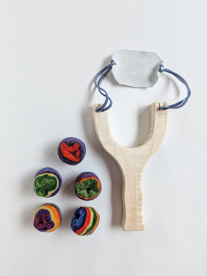 Includes one maple wood slingshot + five 100% wool felt balls