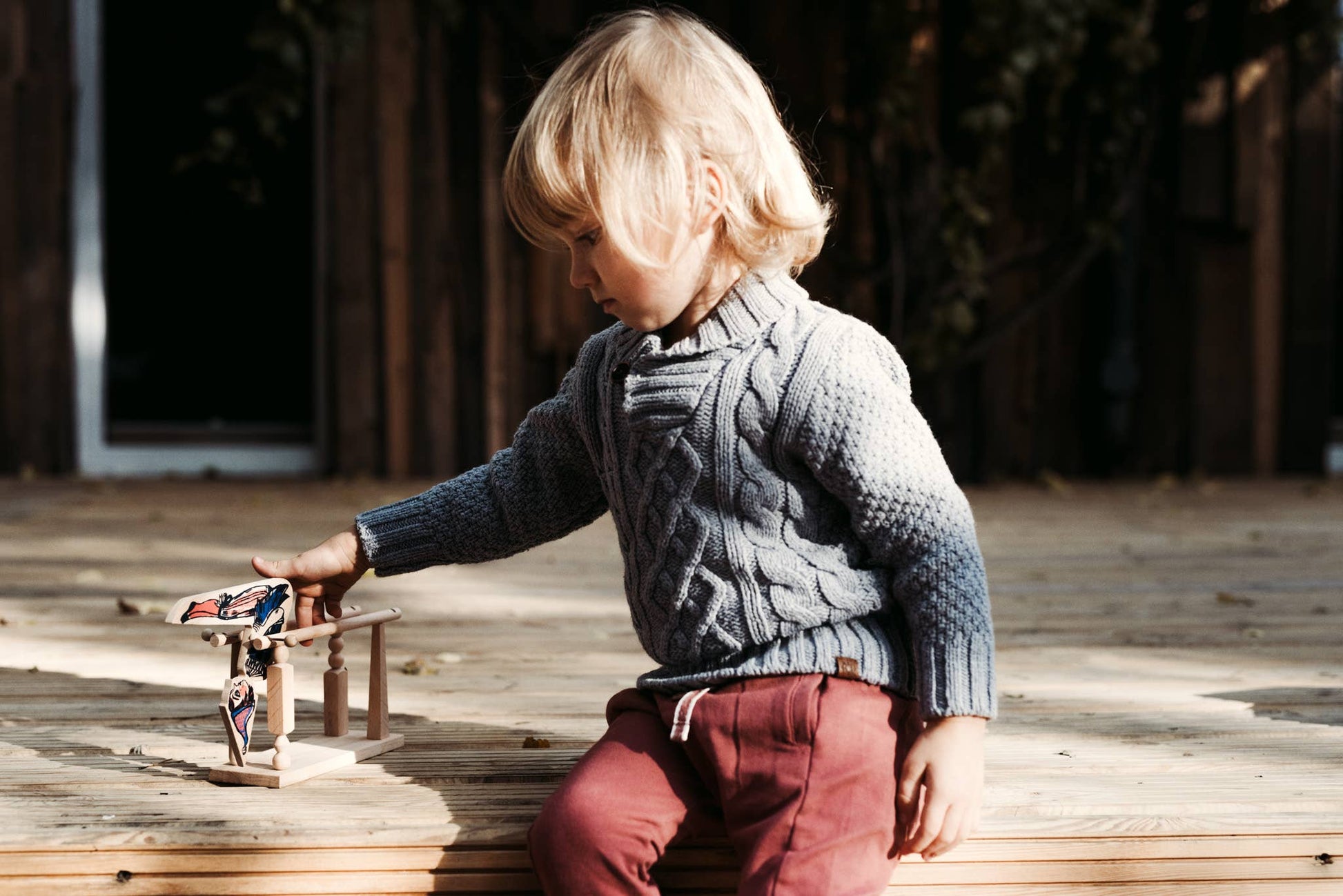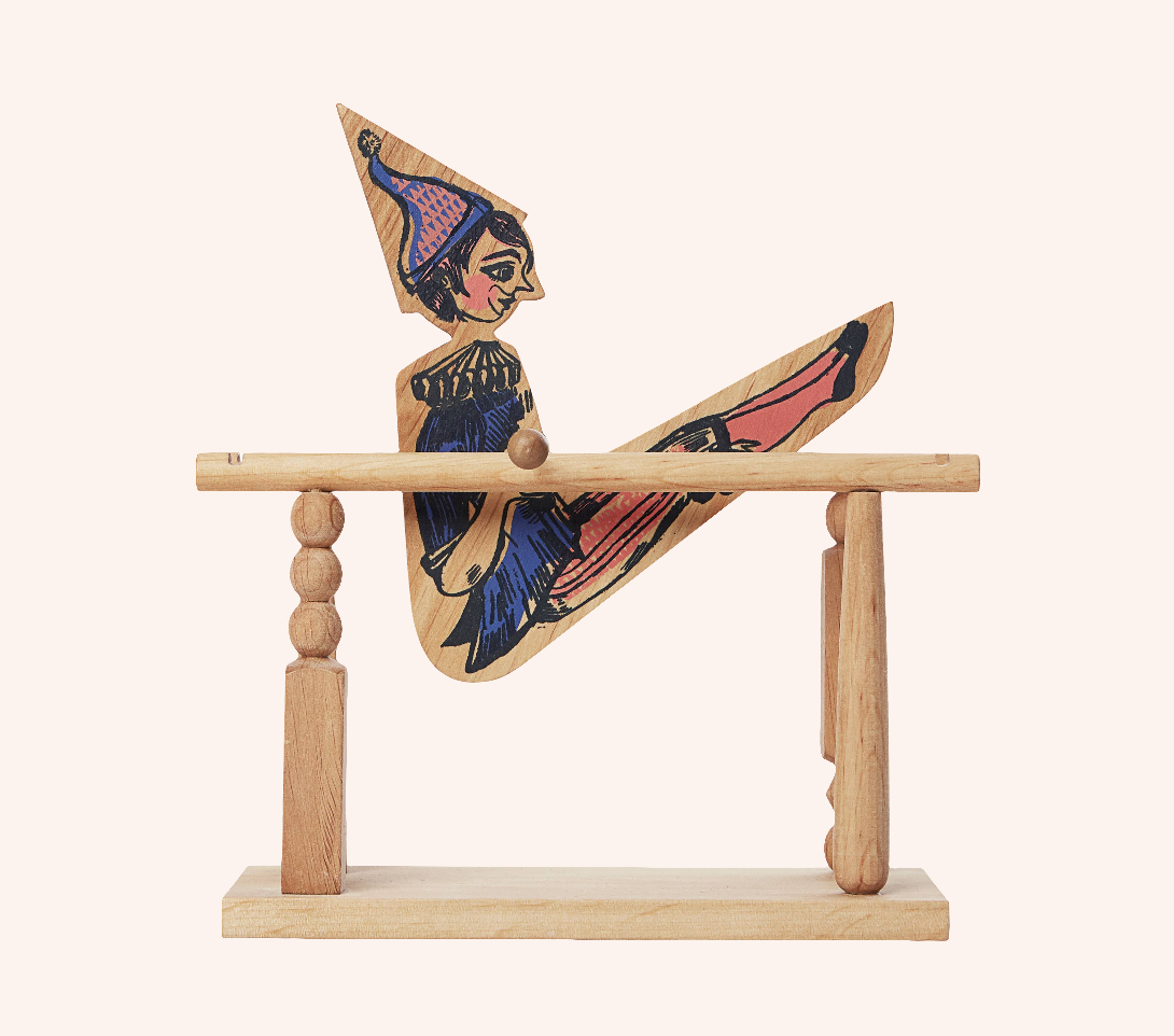 Acrobat Boy toy performing flips and acrobatics with a bar on rails. Playing with it, the child trains his manual skills and precision. The toy, apart from joy and great fun, also has a calming and soothing effect through the uniform circular movements performed by the acrobat and also encourages physical activity.